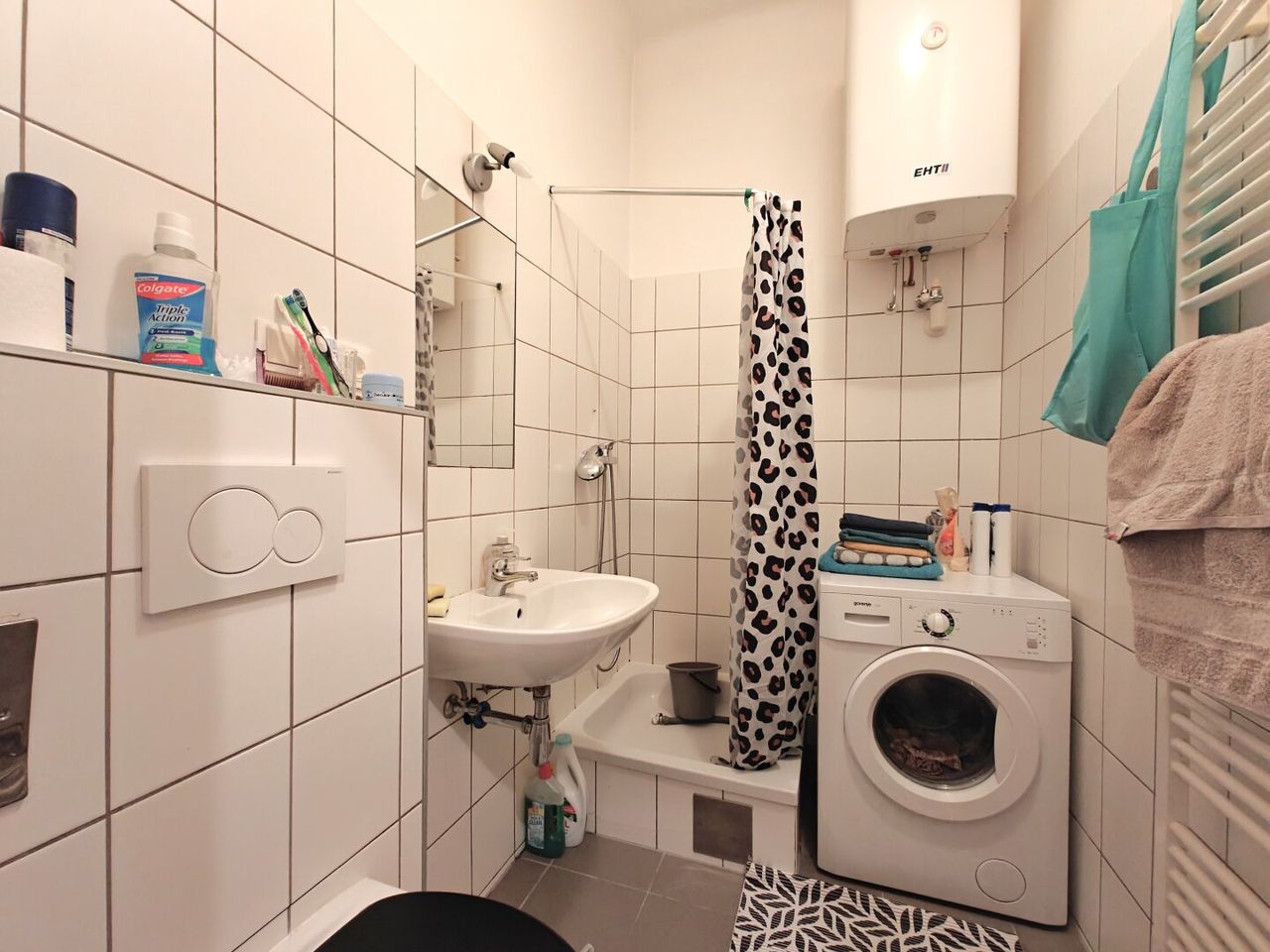 + Badezimmer mit Dusche, Waschbecken, Waschmaschinenanschluss und Toilette