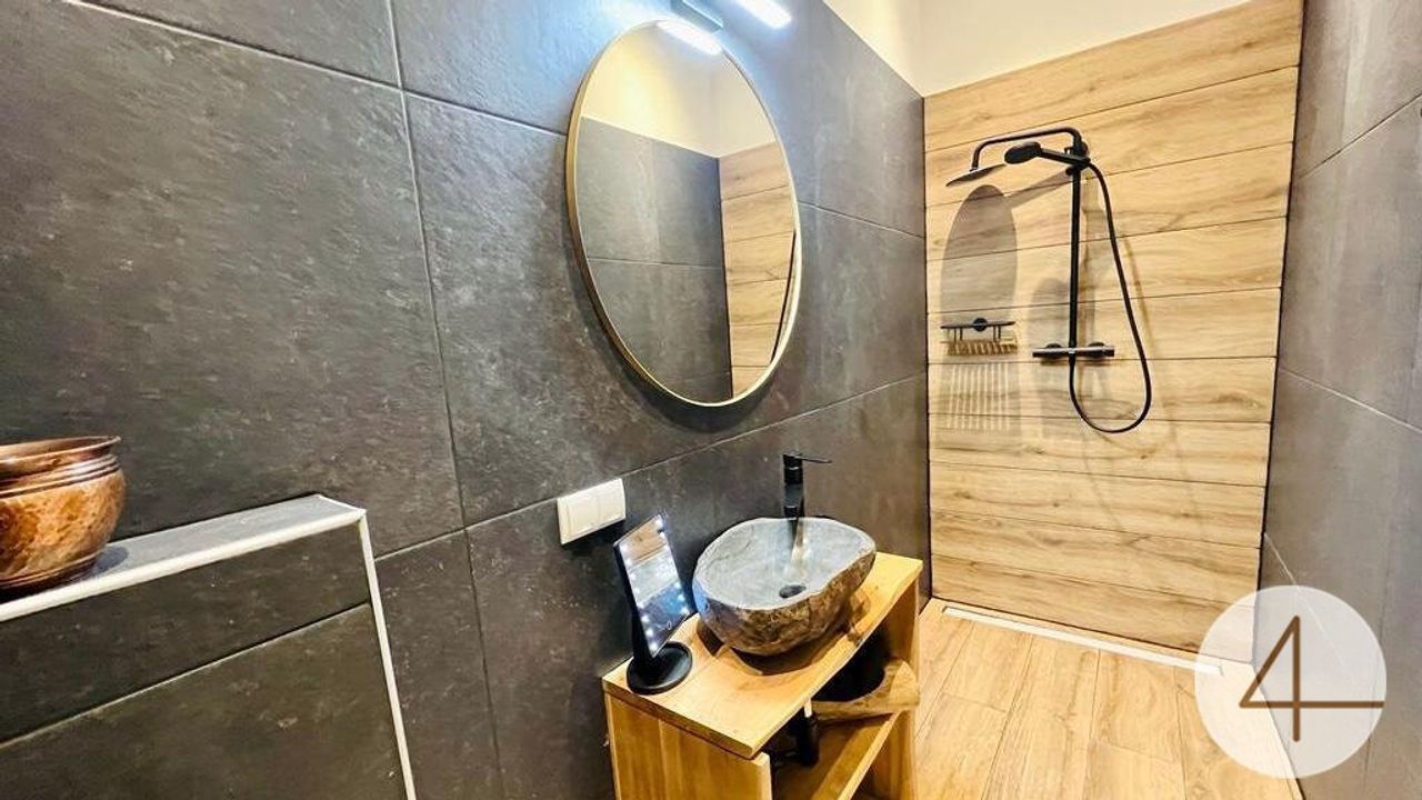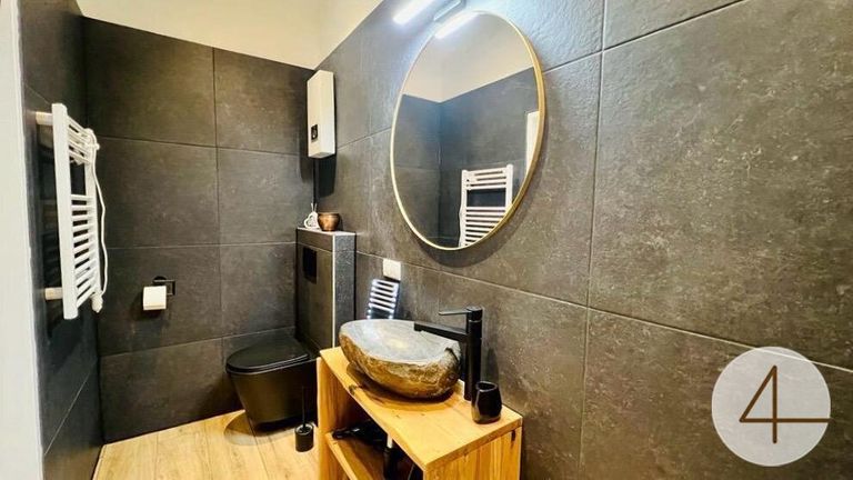 - Modernes Bad: Das Badezimmer überzeugt durch zeitgemäßes Design mit großformatigen Fliesen, einer bodenebenen Walk-In Dusche und hochwertigen Armaturen.
