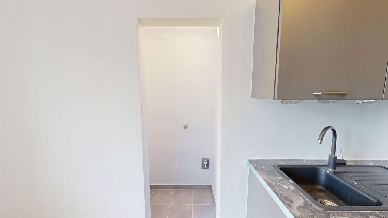 Das Badezimmer befindet sich im bestehenden Zustand, während das separate WC vollständig erneuert wurde. Die vorhandene Küche ist funktional ausgestattet und verfügt unter anderem über einen neuen Siemens Elektroherd und Backofen. Ein Waschmaschinenanschluss befindet sich in einer dafür vorgesehenen Nische in der Küche.