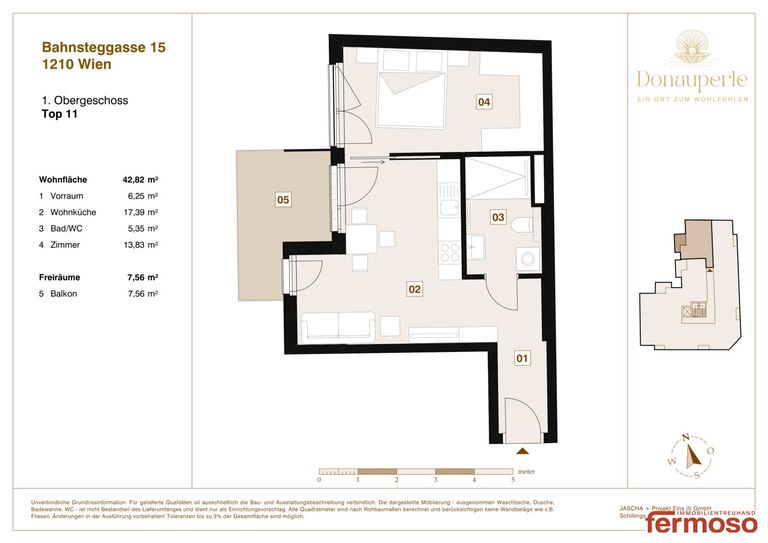In der modernen Donau Perle in der Bahnsteggasse 15 erwartet Sie diese perfekt geschnittene 2-Zimmer-Wohnung mit ca. 42,95 m² Wohnfläche und einem sonnigen Balkon (7,56 m²). Ideal für Singles oder Paare, die modernes Wohnen mit hoher Lebensqualität verbinden möchten.