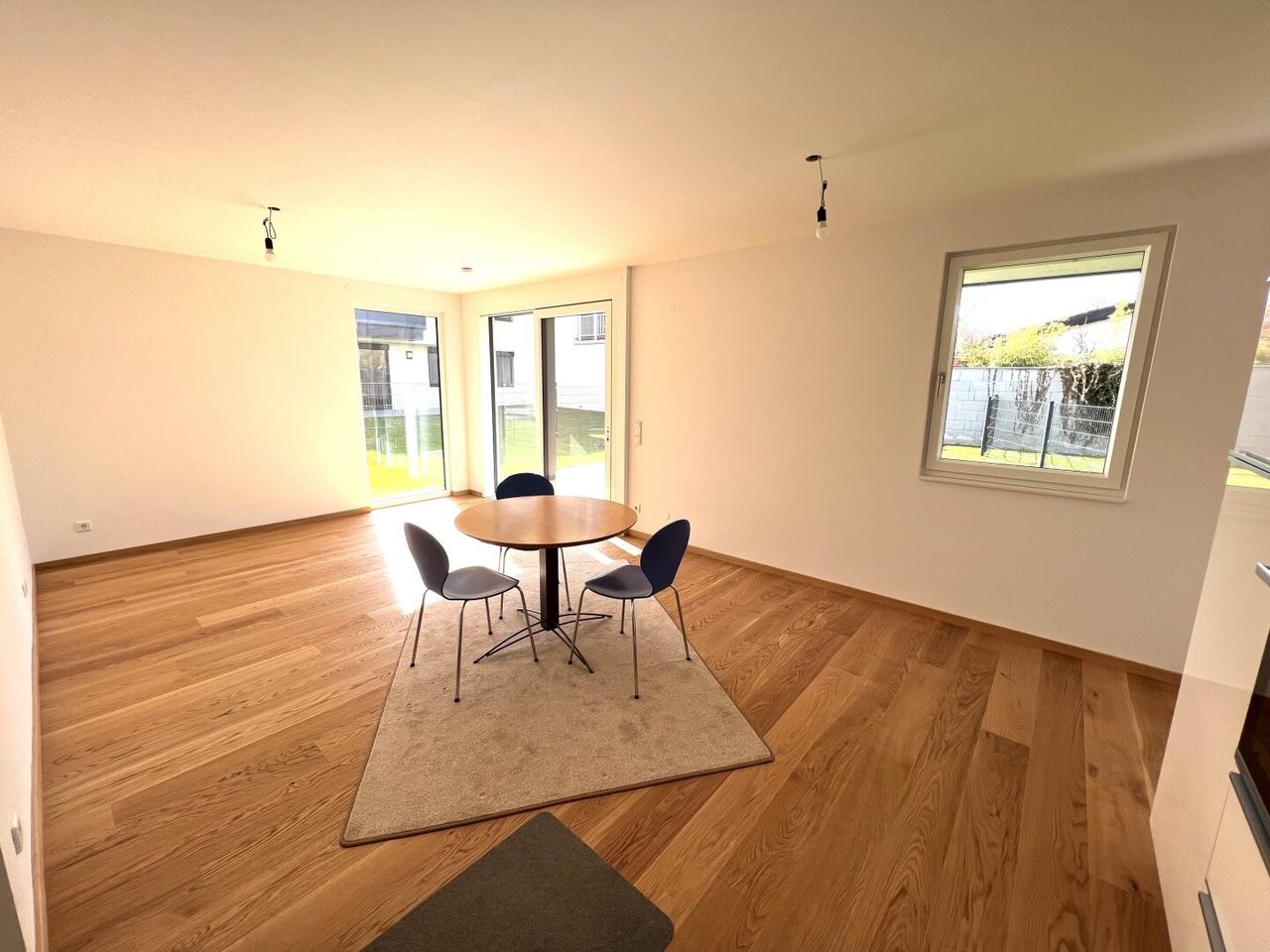 Die Wohnung beeindruckt durch ihre großartige Raumaufteilung und die hochwertige Ausstattung. Das Wohnzimmer verfügt über ein Schiebefenster in Raumhöhe, welches den Zugang zur Terrasse und dem großzügigen Garten ermöglicht. Durch die elektrisch bedienbaren Außenbeschattungen haben Sie stets die Möglichkeit, natürliches Licht und Luft in den Räumlichkeiten einzulassen.