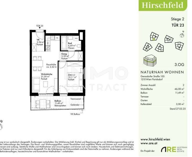 Willkommen im Hirschfeld – Leben im Grünen, nördlich der Donau Am Rande eines weitläufigen Grünzugs, der sich bis zum Bisamberg erstreckt, entsteht im naturnahen Hirschfeld ein einzigartiges Wohnquartier: Auf drei Bauplätzen entwickelt sich ein modernes Architektur-Ensemble mit elf Gebäuden und rund 440 Wohnungen – ideal für alle, die Ruhe im Grünen mit urbaner Lebensqualität verbinden möchten. Vielfalt und Lebensqualität Hirschfeld bietet durchdachten Wohnraum für Familien, Paare, Singles und Menschen jeden Alters. Das Quartier ist geprägt von einem lebendigen Miteinander – ein Ort des Ankommens, des Begegnens und des Verweilens. Die Esplanade mit Allee, der zentrale Quartiersplatz sowie zahlreiche lauschige Plätze...