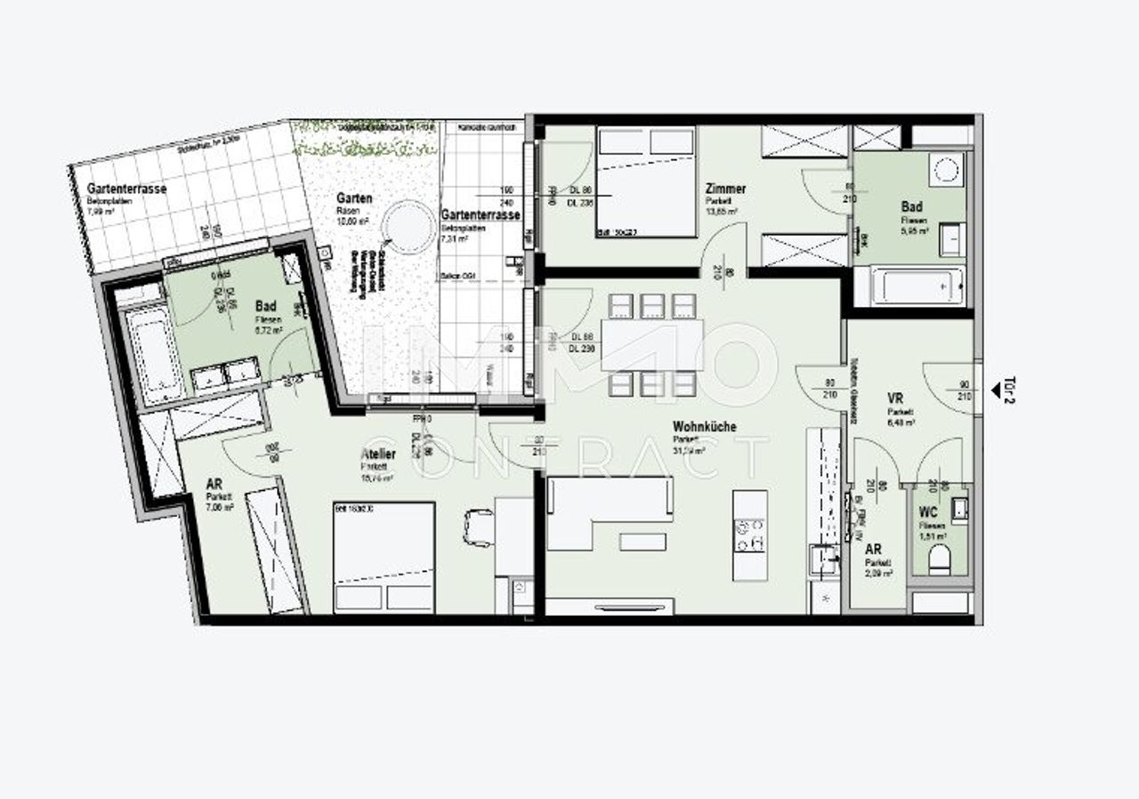 Willkommen in Ihrem neuen Zuhause: Diese großzügige, komplett hofseitig ausgerichtete 3-Zimmer-Gartenwohnung überzeugt mit rund 91 m² Wohnnfläche, zwei Terrassen sowie einem privaten Garten. Die helle Wohnküche mit direktem Zugang zur südostseitigen Gartenterrasse bildet das Herzstück der Wohnung und schafft einen fließenden Übergang zwischen Innen- und Außenbereich. Zwei komfortable Zimmer – eines davon mit großzügigem Schrankraum bzw. Garderobe – verfügen jeweils über ein eigenes en-suite Badezimmer und sorgen für hohen Wohnkomfort sowie ein angenehmes Maß an Privatsphäre. Großzügige Fensterflächen durchfluten die Räume mit Tageslicht und verleihen der Wohnung eine besonders freundliche und einladende Atmosphäre....