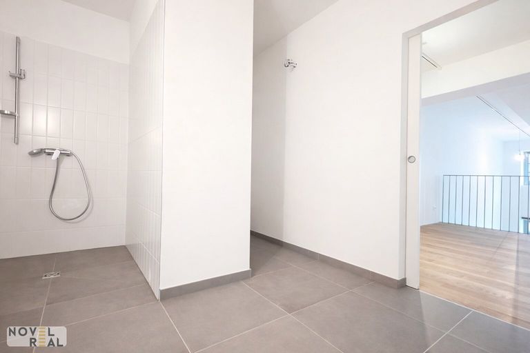 Das Badezimmer ist mit hochwertigen Fliesen ausgestattet und bildet einen eleganten, funktionalen Rückzugsort. Ein zusätzlicher Stauraum ergänzt die Ebene und sorgt für Ordnung und Struktur.