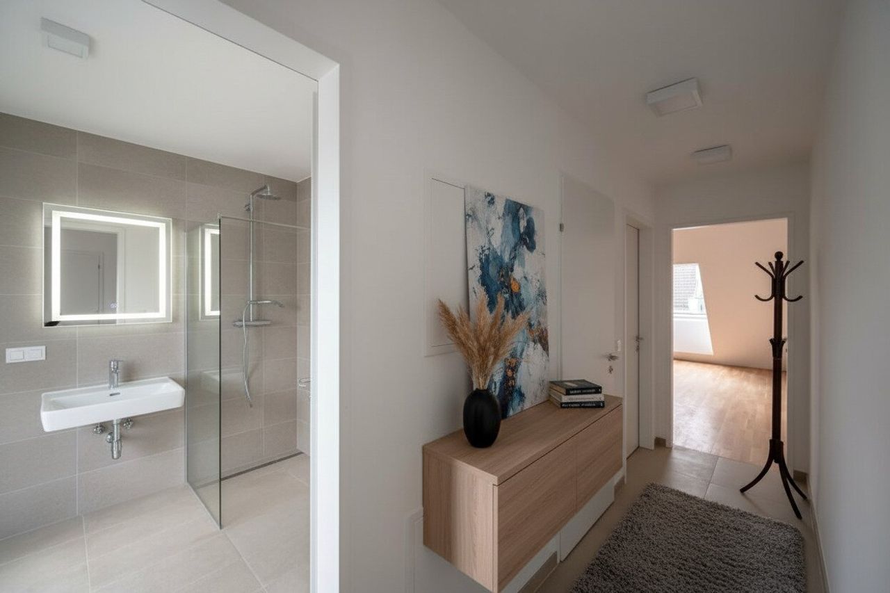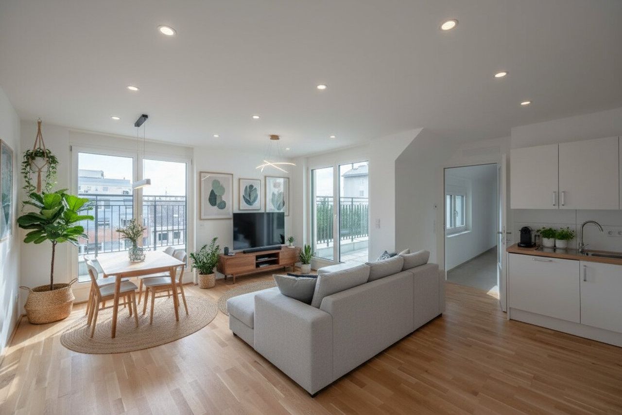 Nach dem Fotoshooting durch unsere Fotografen wurden einzelne Bilder mit einer AI Software nachbearbeitet. Die Möblierungsvorschläge sind nicht inkludiert, ausgenommen der oben beschriebenen Möblierung.