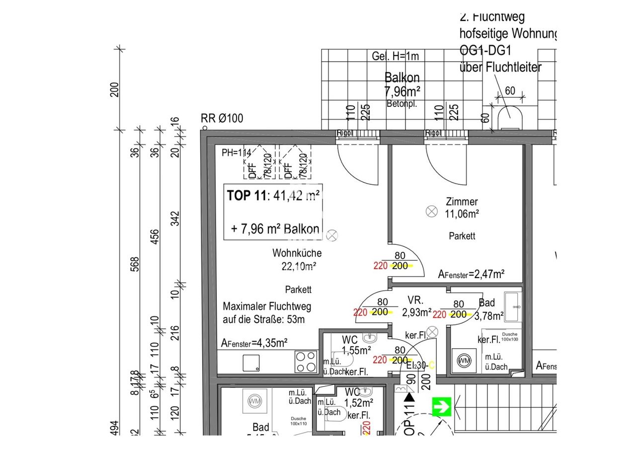 - Telefon/Daten: Leerverrohrung im Vorzimmer, TV: Anschluss im Wohnzimmer, restliche Räume Leerverrohrung