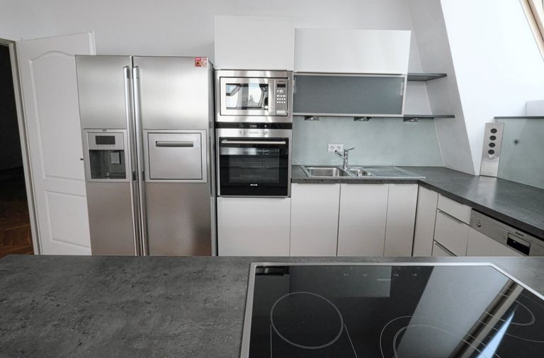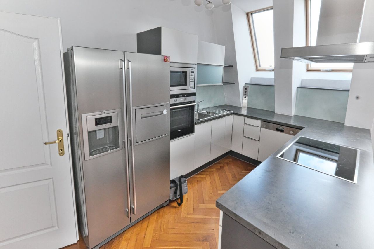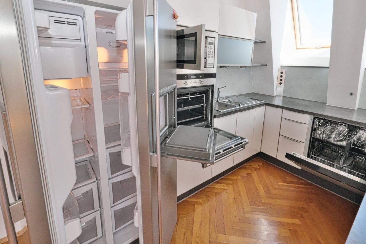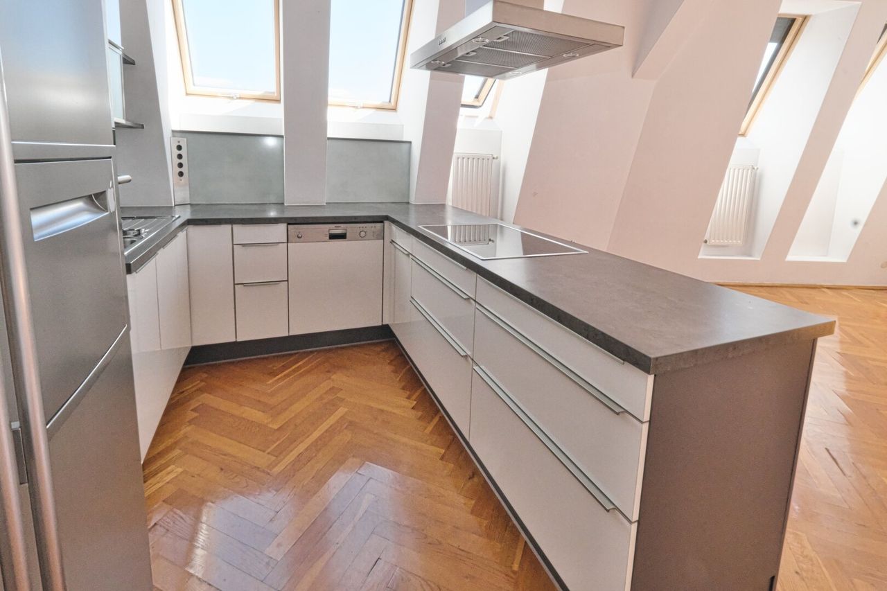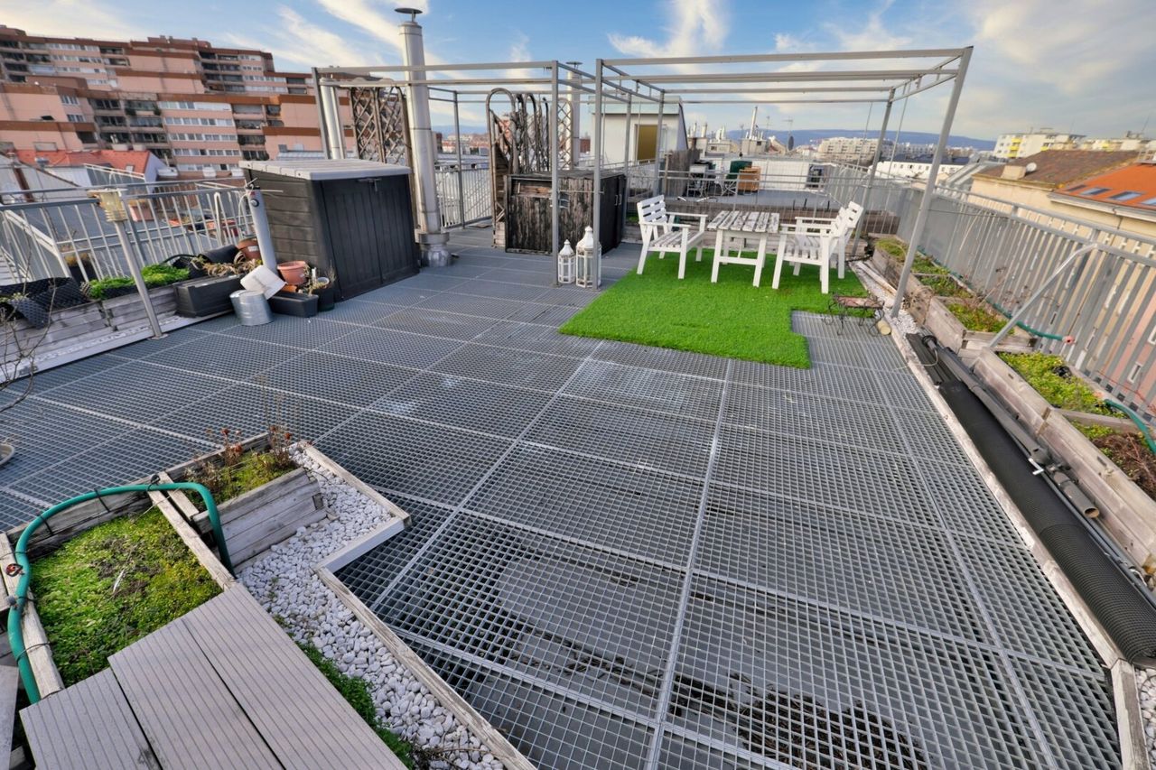 Die Wohnung verfügt über eine Dachterrasse mit 360 Grad Panorama-Fernblick über die Dächer Wiens. Freiluftdusche (Wasser und Strom auf der Terrasse).