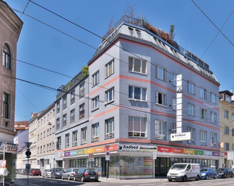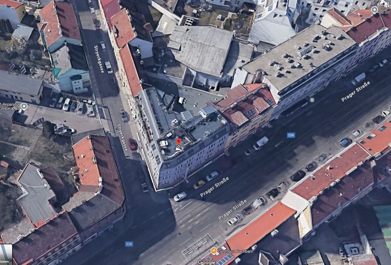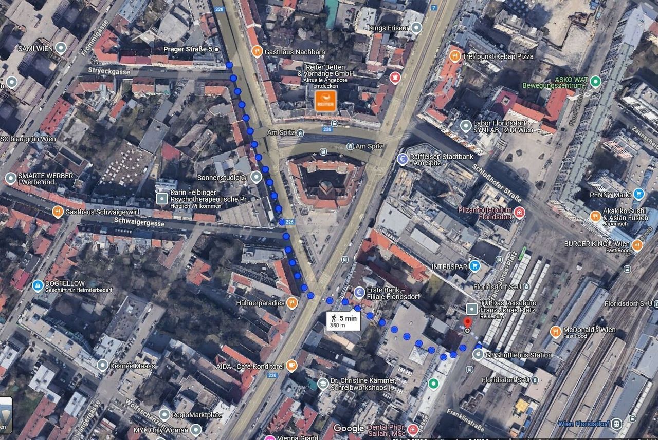 Zentrale Lage: Direktnähe 'Am Spitz', in der Prager Straße 5 / Bahnhof Floridsdorf 5 Gehminuten oder 350 m: S-Bahn, U6, Straßenbahnlinien 2, 25, 26, Autobuslinie 28A, 29A, 34A. Die Prager Straße wurde vor dem Haus vor kurzem in eine Einbahn umgestaltet, daher auch kein störender Verkehrslärm.