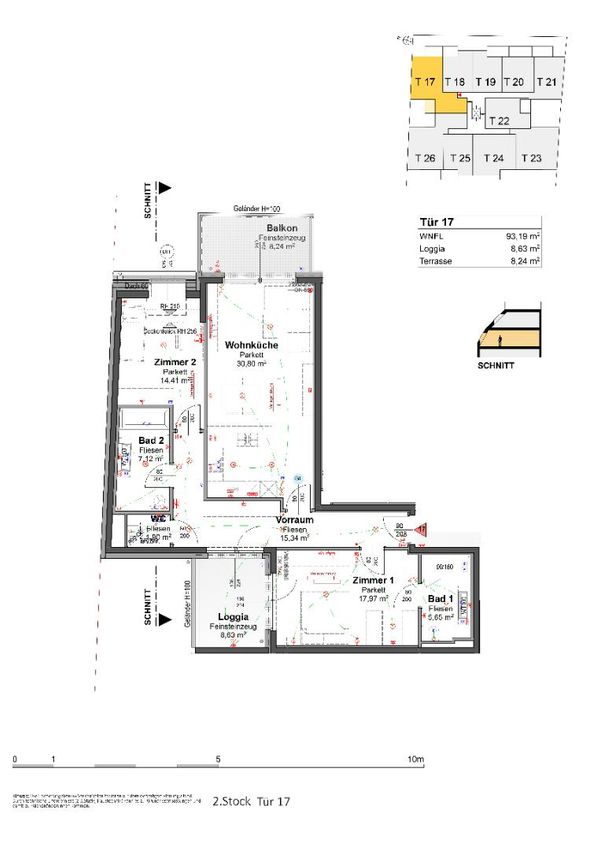Die Top 17 ist eine 94 m², 3 Zimmerwohnung mit 2 Terrassen und befindet sich im 2.OG des Hauses. Der Grundriss ist sehr kompakt und alle Zimmer sind getrennt begehbar. Der Eingangsbereich ist groß und bietet ausreichend Garderobenplatz. Von hier, direkt begehbar sind die Schlafzimmer mit jeweils ein Bad-en-Suite eines davon mit eigener Terrassenausgang, eine Gästetoilette sowie das Wohnzimmer mit offener Küche und einen Ausgang auf einer 2te Terrasse.