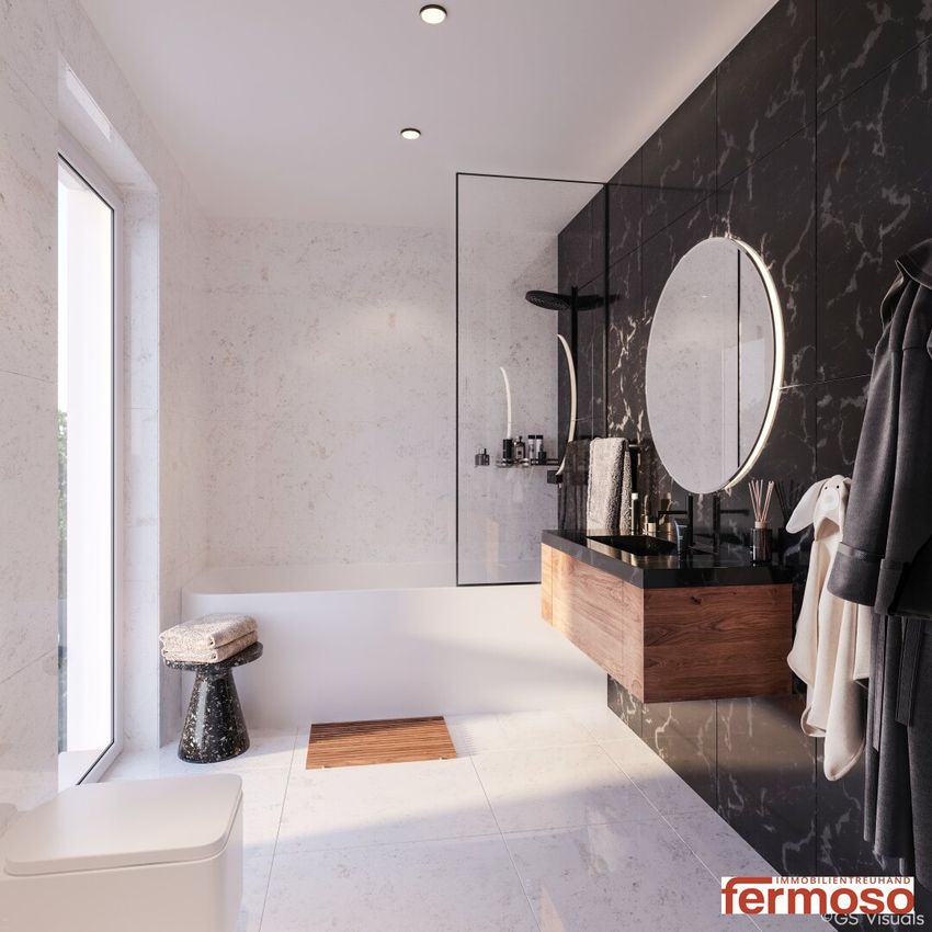 Hochwertige Materialien: Parkett, moderne Fliesen, Fußbodenheizung