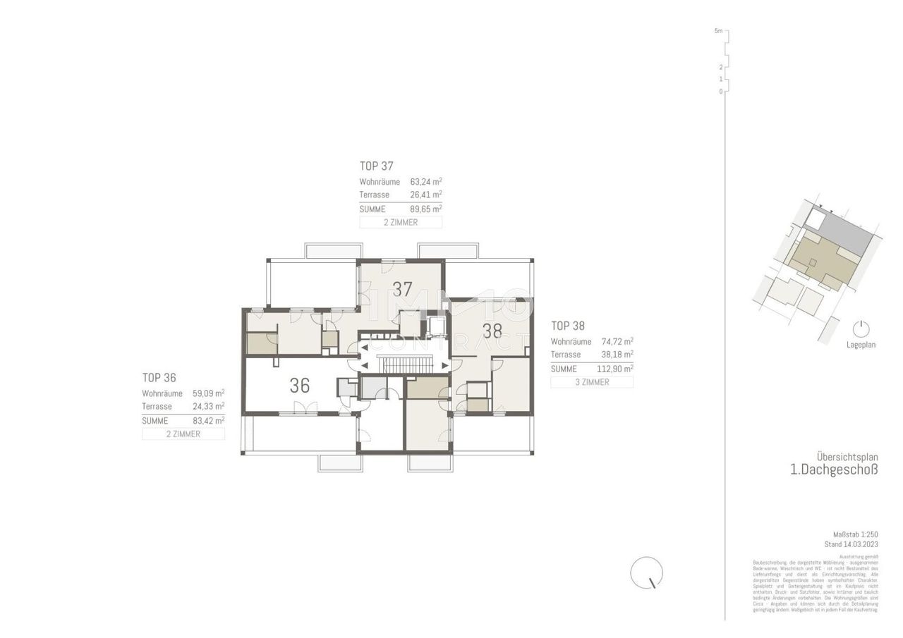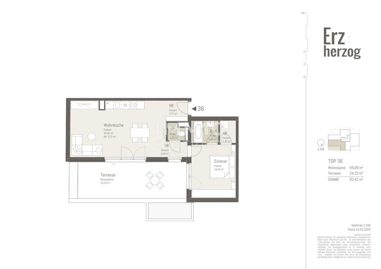 Vom Vorraum mit Platz für eine Garderobe erreicht man das Wohnesszimmer. Vom geräumigen Wohnesszimmer geht es direkt auf die 24 m² große Terrasse die gerahmt einen Ausblick auf die Stadt und viel Freiraum bietet. Auch das Schlafzimmer hat einen direkten Zugang auf die Terrasse. Ein Schrankraum und das Badezimmer sind dem Schlafzimmer Ensuite zugeordnet. Das Gäste WC betritt man von einem Vorraum direkt vor dem Schlafzimmer.