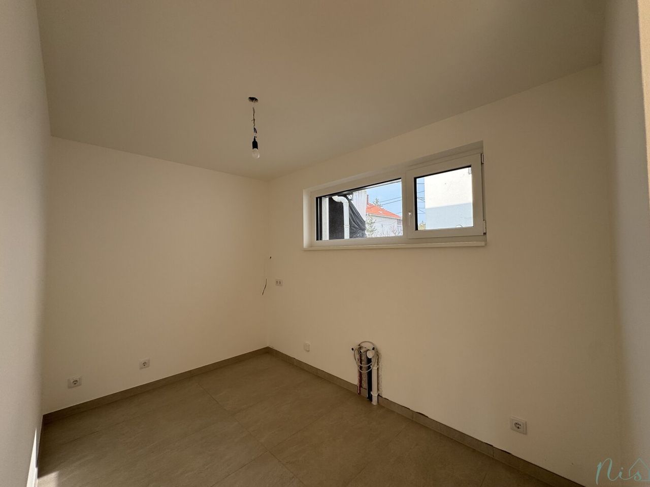 Das moderne Badezimmer mit Fenster ist mit hochwertigen Fliesen im Format 120x60 ausgestattet, hat eine Unterputz-Regendusche, einen großen Waschtisch und einen Waschmaschinenanschluss.