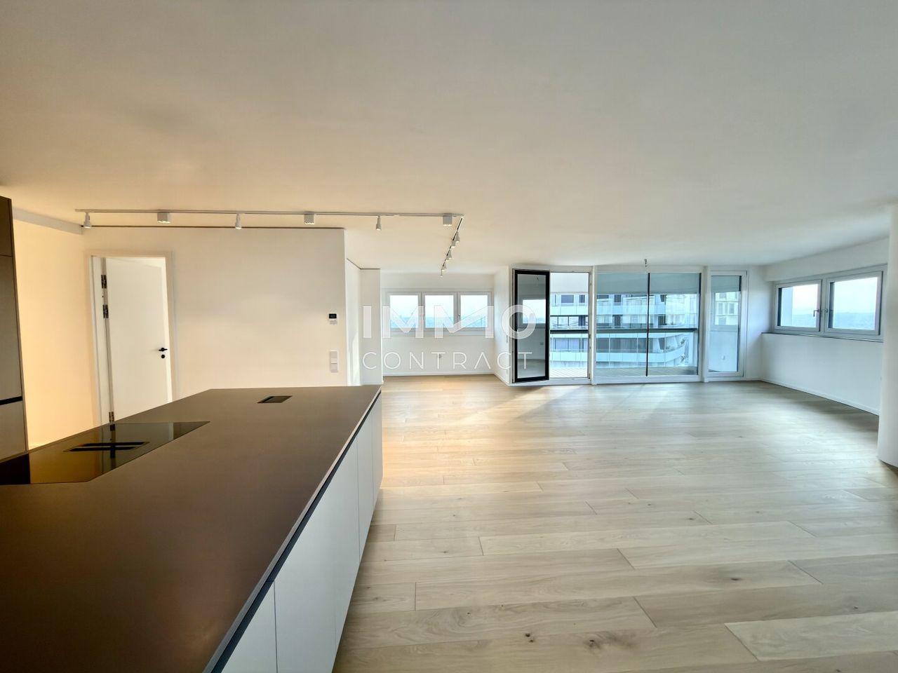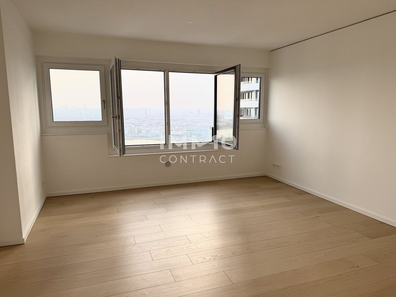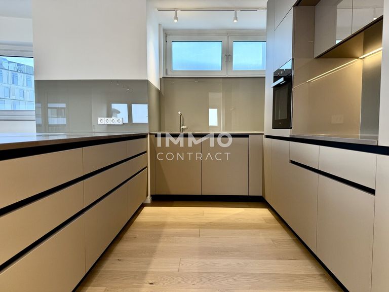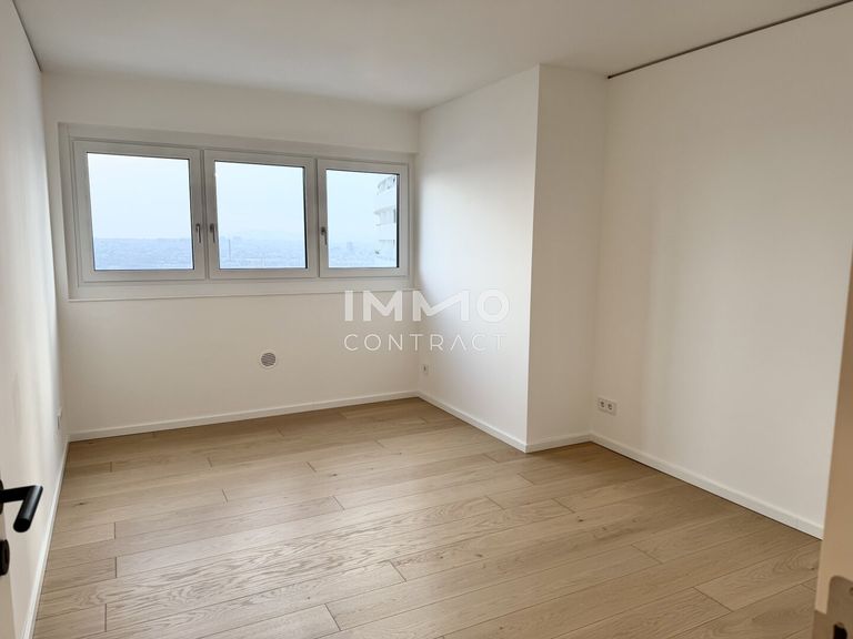 The apartment is characterized by bright, open interiors and a sophisticated finish throughout, creating a harmonious balance between comfort and contemporary design. At its heart lies a spacious living area that seamlessly connects to a generous skyline loggia, offering breathtaking panoramic views across the river and Vienna’s iconic skyline.