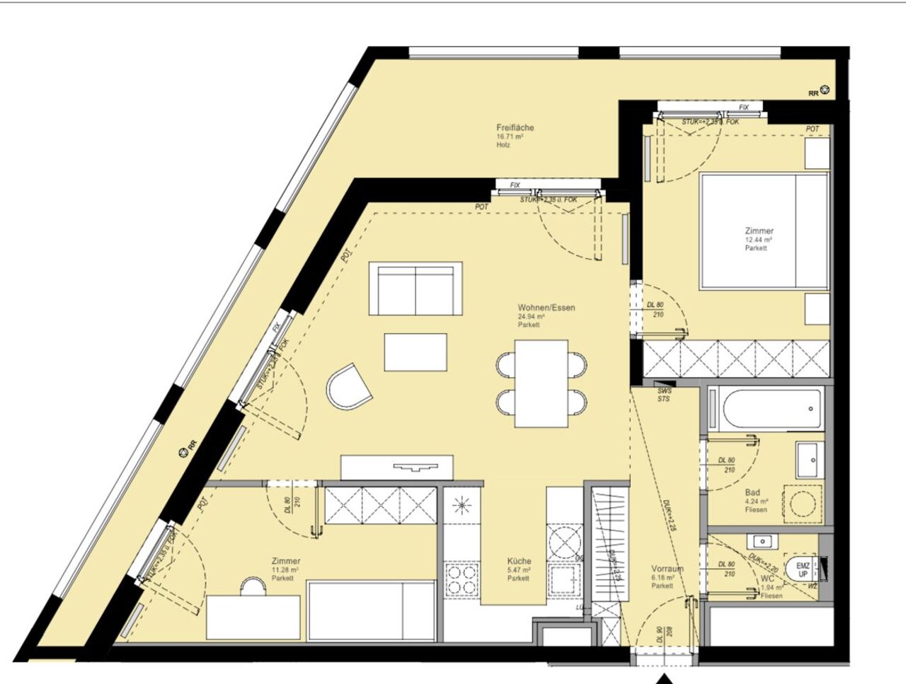 Die Wohnung verfügt über raumhohe dreifach-verglaste Fenster, sowie eine vorgelagerten Loggia, die von jedem Zimmer aus separat begehbar ist.