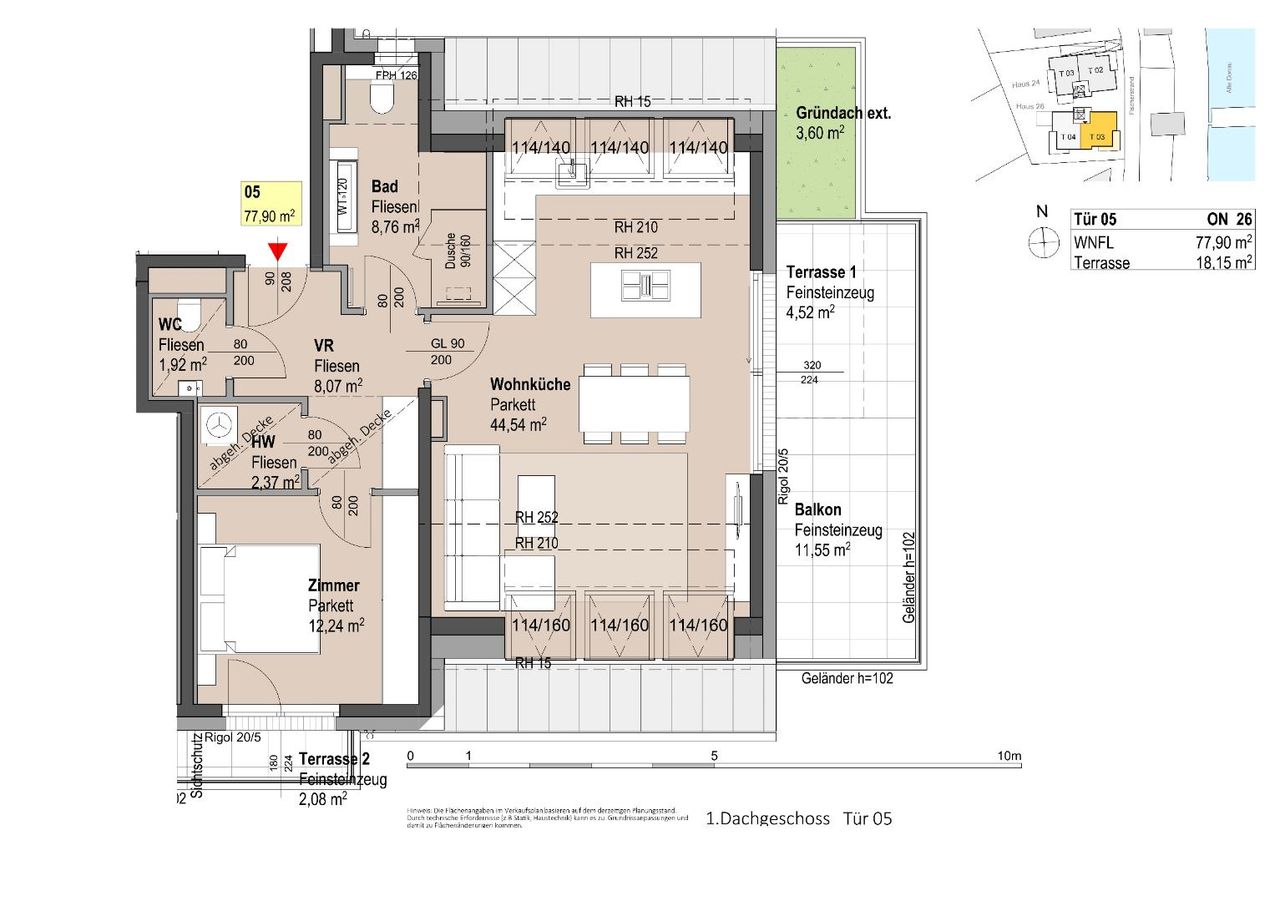 Die Top 205 ist eine 78 m², 2 Zimmerwohnung mit Terrasse und befindet sich im DG des Hauses. Alle Zimmer sind getrennt begehbar. Zur Verfügung stehen ein großes Wohnzimmer mit offener Küche und Ausgang auf einer Süd- und Ost-seitige Terrasse, 1 Schlafzimmer, ein großes Bad mit walk-in Dusche, und Toilette, ein Abstell-/Wirtschaftsraum und eine separate Toilette. Beeindruckend!