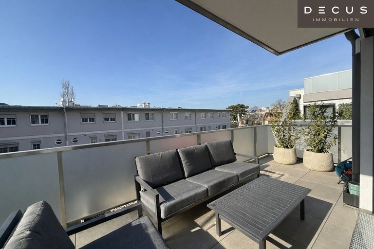 Der repräsentative Wohnbereich öffnet sich direkt zur großzügigen Terrasse und erweitert den Lebensraum ins Freie – ideal für entspannte Stunden, stilvolle Abende oder ein Frühstück in der Sonne. Eine zweite, vom Schlafzimmer aus zugängliche Terrasse bietet zusätzlichen privaten Rückzugsraum und unterstreicht den besonderen Wohnkomfort dieser Immobilie.