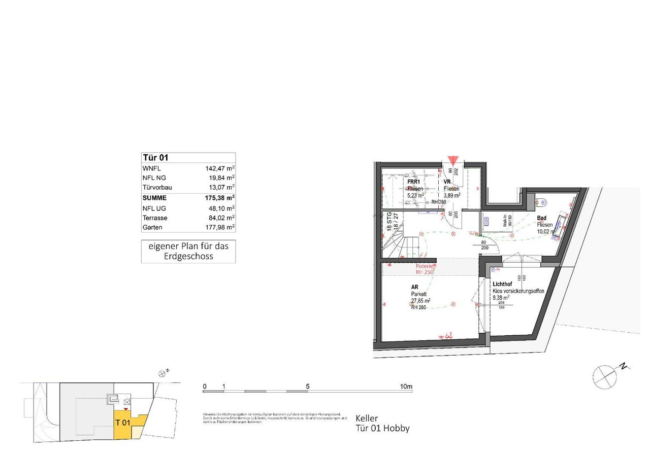 Top 1 is a 175 m², 5 rooms apartment with 84 m² terraces and 178 m² own garden. All rooms are separately accessible. On the ground floor, are available, a generous living with open kitchen and exit into the south-west-oriented garden, 4 bedrooms, all with own terrace/garden exit, 3 big bathrooms with walk-in shower, tube and toilette as well as a laundry room and a separate toilette. The basement offers place for an office/hobby room, a further bathroom and a storage / bicycle room. From here one can directly access the garage.