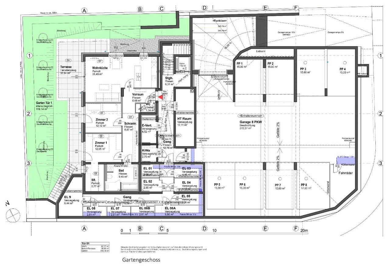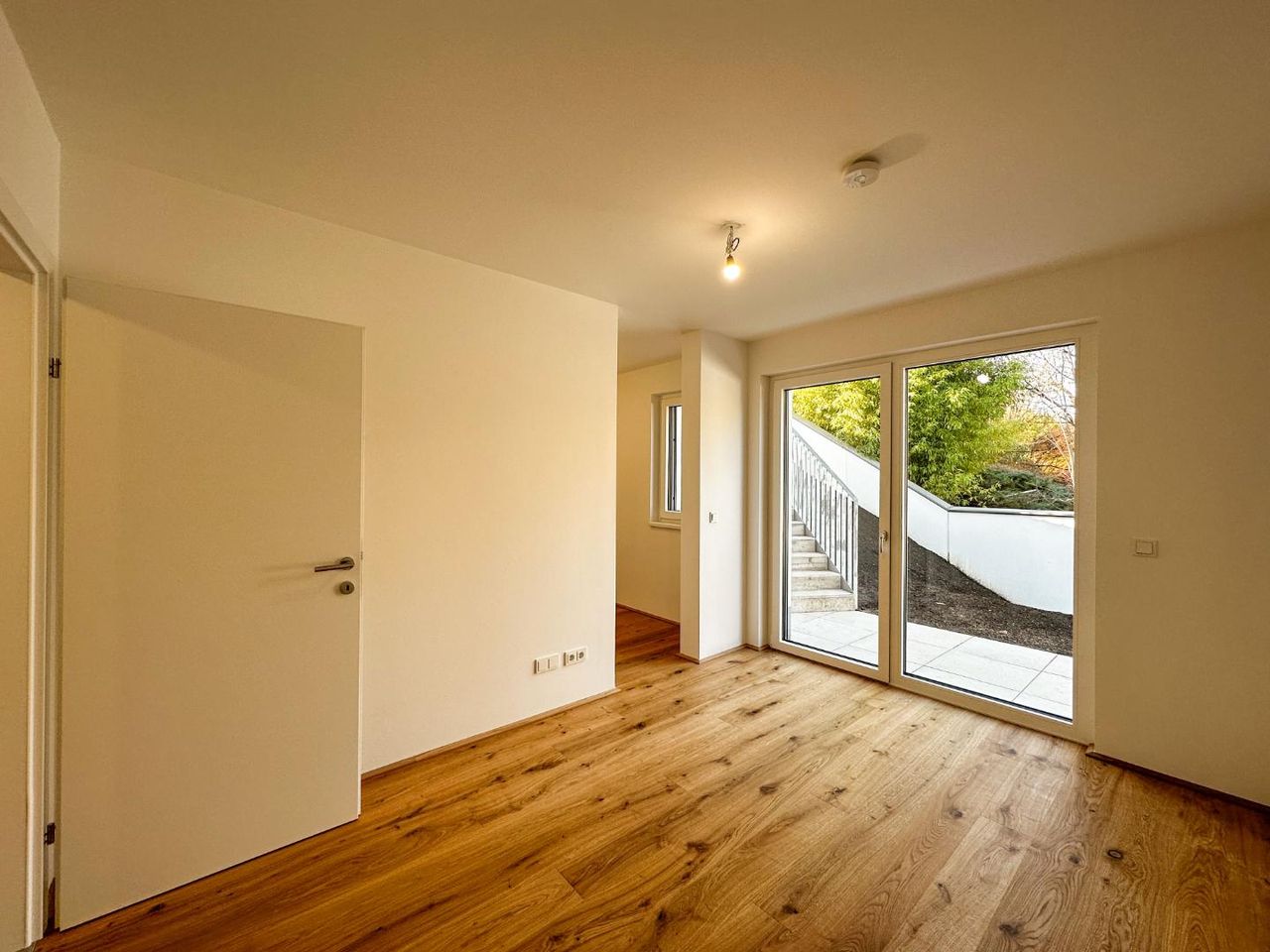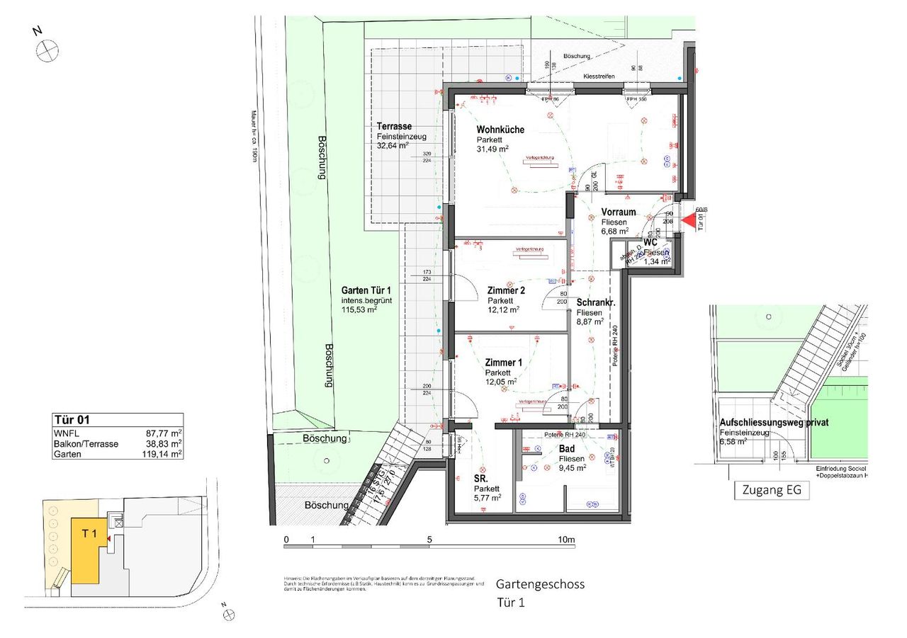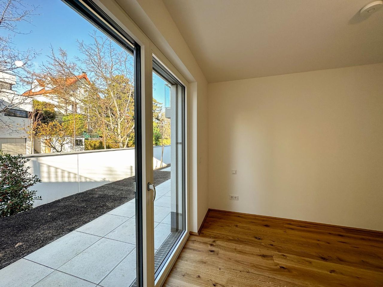 Die Top 1 ist eine 88 m², 3 Zimmerwohnung mit 39 m² Terrasse und 119 m² Eigengarten und befindet sich durch die Hanglage im Gartengeschoss der Hausanlage. Alle Zimmer sind getrennt begehbar. Zur Verfügung stehen, ein großes Wohnzimmer mit offener Küche und Aus-gang in einer West-seitige Garten, 2 Schlafzimmer, eines davon mit begehbarer Garderobe, alle mit eigenen Terrassen/Gartenausgang, ein großes Bad mit walk-in Dusche, Badewanne und Toilette sowie eine separate Toilette. Hinzu kommt die Möglichkeit eines eigenen direkten Zugangs zur Wohnung durch den Garten aber auch durch das Stiegenhaus.