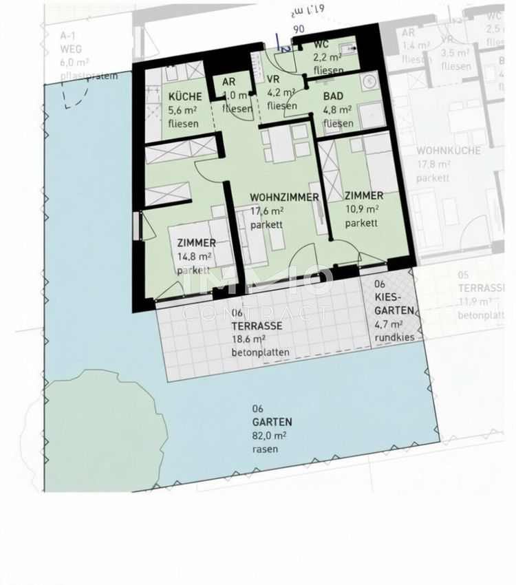 - Jede Wohnung mit privater Freifläche (Loggia, Balkon, Terrasse, Eigengarten)
