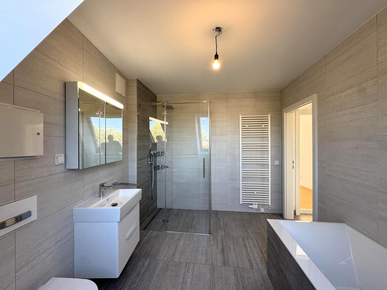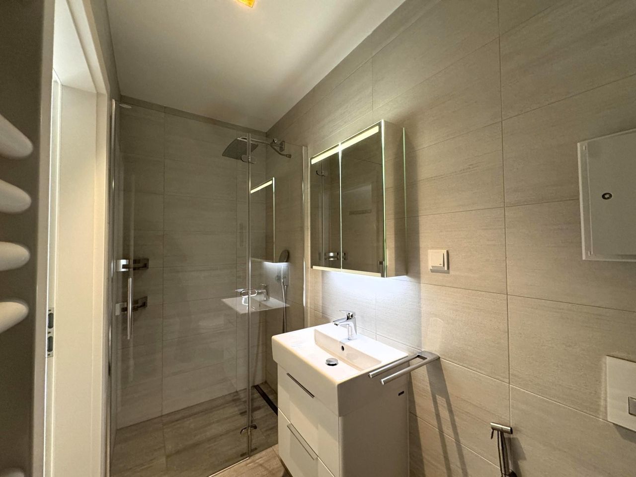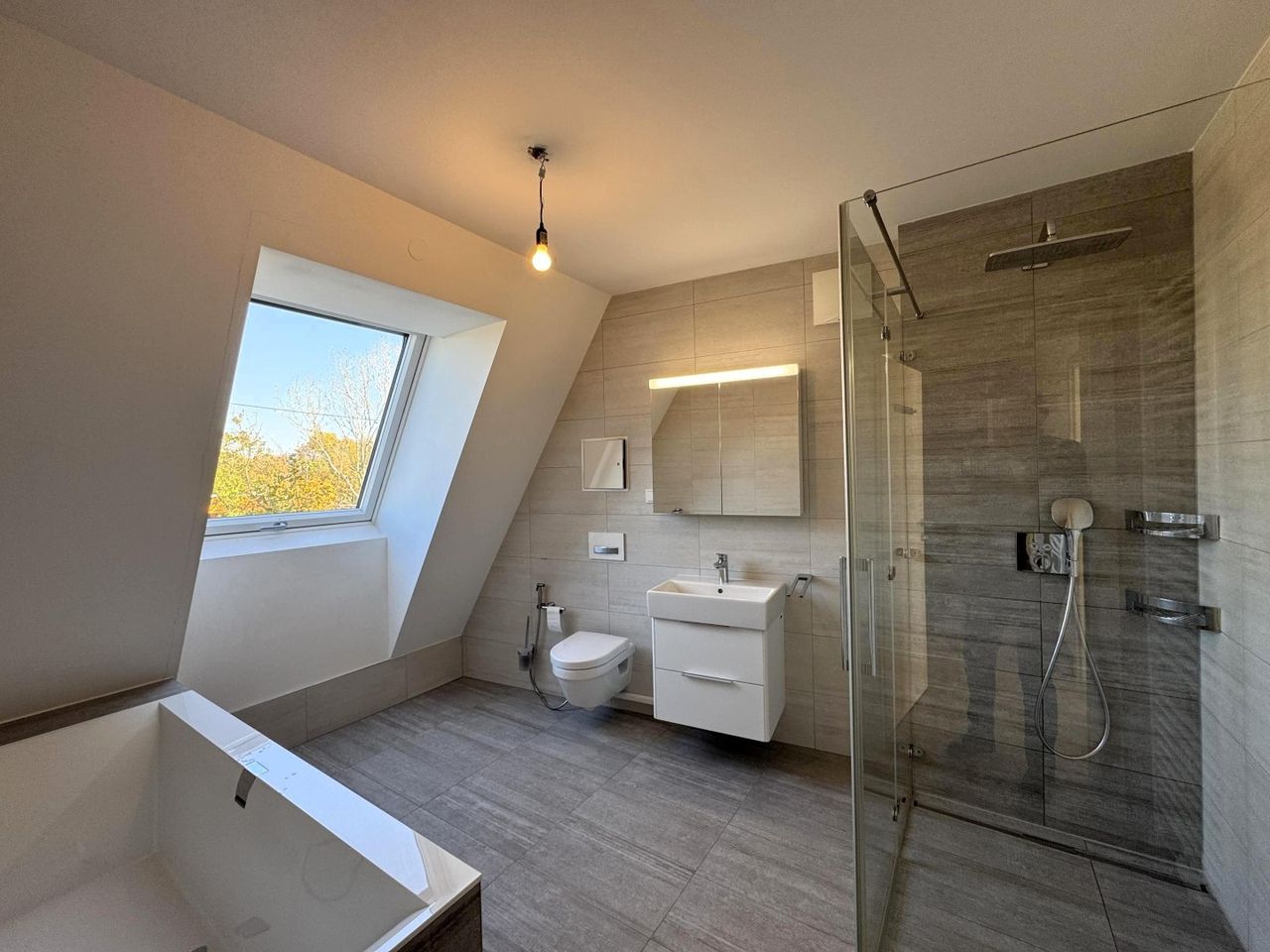 The apartment is located on the first attic floor of the house. It is generously cut, very bright and all rooms are separately accessible. At the entrance three is plenty of wardrobe space. Both bedrooms are in the immediate vicinity as well as 2 bathrooms and a laundry room. A generous living room with open kitchen with all appliances by Miele and exit onto the loggia follows.