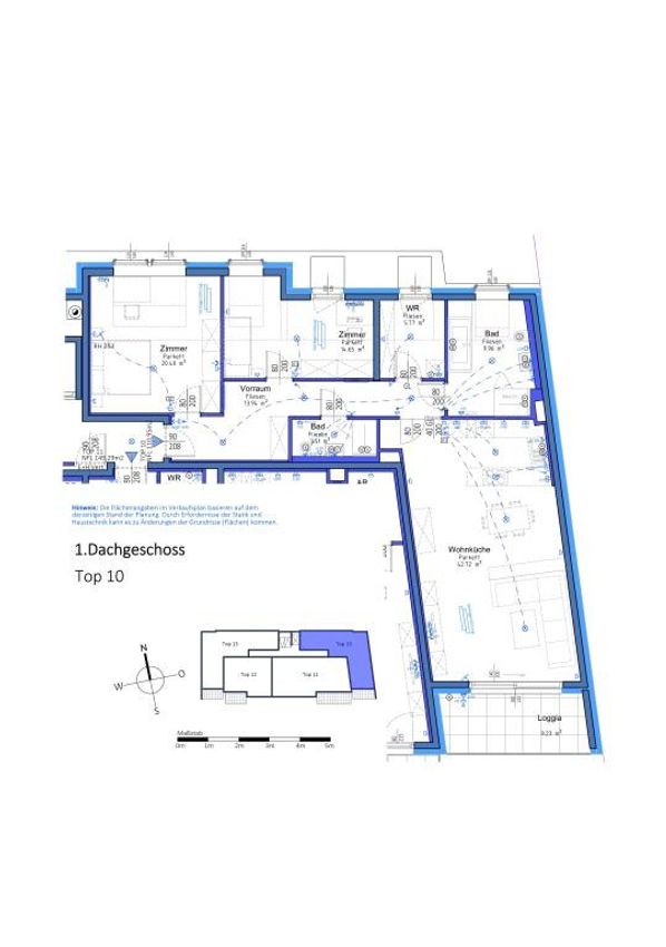 Die Wohnung befindet sich im ersten Dachgeschoss des Hauses. Sie ist sehr hell, großzügig geschnitten und getrennt begehbar. Im Eingangsbereich ist ausreichend Garderobenplatz. Unmittelbar sind beide Schlafzimmer getrennt erreichbar sowie 2 Bäder und ein Wirtschaftsraum. Ein großzügiges Wohnzimmer mit offener Küche mit allen Geräten von Miele und eine daran angeschlossene Loggia folgen.
