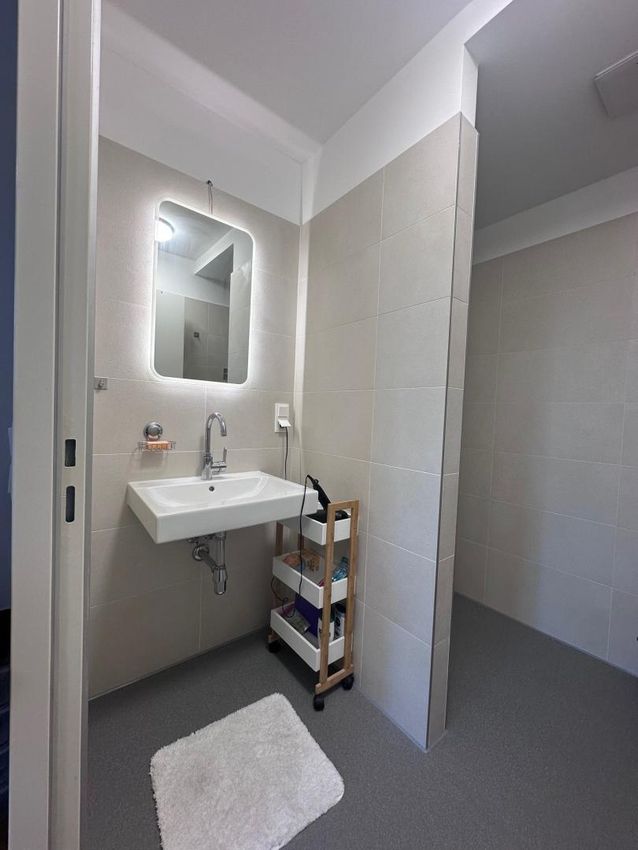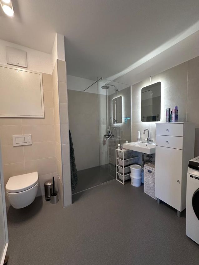 - Großes Badezimmer mit Bodenebene Regen-Dusche, WM/Trockner-Anschluß, WC, mit neuem rutschfesten Epoxi-Harz Belag