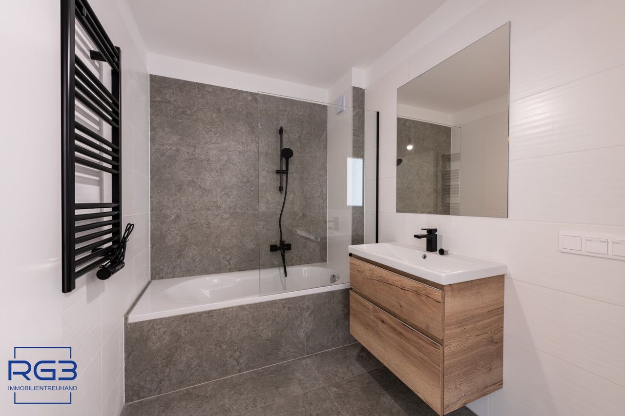 Mit dem Lift fahren Sie bequem in den ersten Stock. Sie betreten die Wohnung und spüren sofort: alles ist neu, alles ist ruhig, alles passt zusammen. Rechts befindet sich ausreichend Platz für Garderobe und Jacken. Links liegt das moderne Badezimmer mit extra Toilette, klar gestaltet, hochwertig ausgeführt.