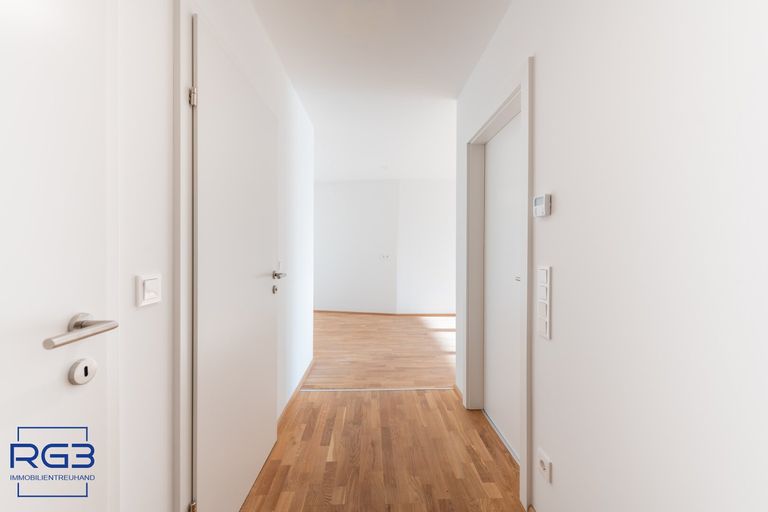 Mit dem Lift fahren Sie bequem in den ersten Stock. Sie betreten die Wohnung und spüren sofort: alles ist neu, alles ist ruhig, alles passt zusammen. Rechts befindet sich ausreichend Platz für Garderobe und Jacken. Links liegt das moderne Badezimmer mit extra Toilette, klar...