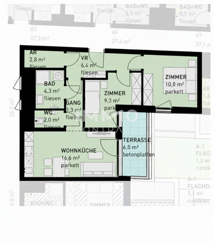 - Jede Wohnung mit privater Freifläche (Loggia, Balkon, Terrasse, Eigengarten)