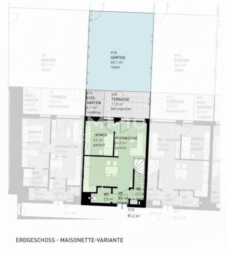 Bei Bedarf an mehr Wohnfläche berät das Vertriebsteam gern: Auf Wunsch lassen sich übereinanderliegende Einheiten zu einer Maisonette (4 Zimmer) verbinden oder nebeneinanderliegende Wohnungen zu größeren Einheiten zusammenlegen. Für Eigentümer besteht optional die Möglichkeit eines eigenen Gartenabteils; alle Gartenflächen werden mit Strom und Wasseranschluss versehen.