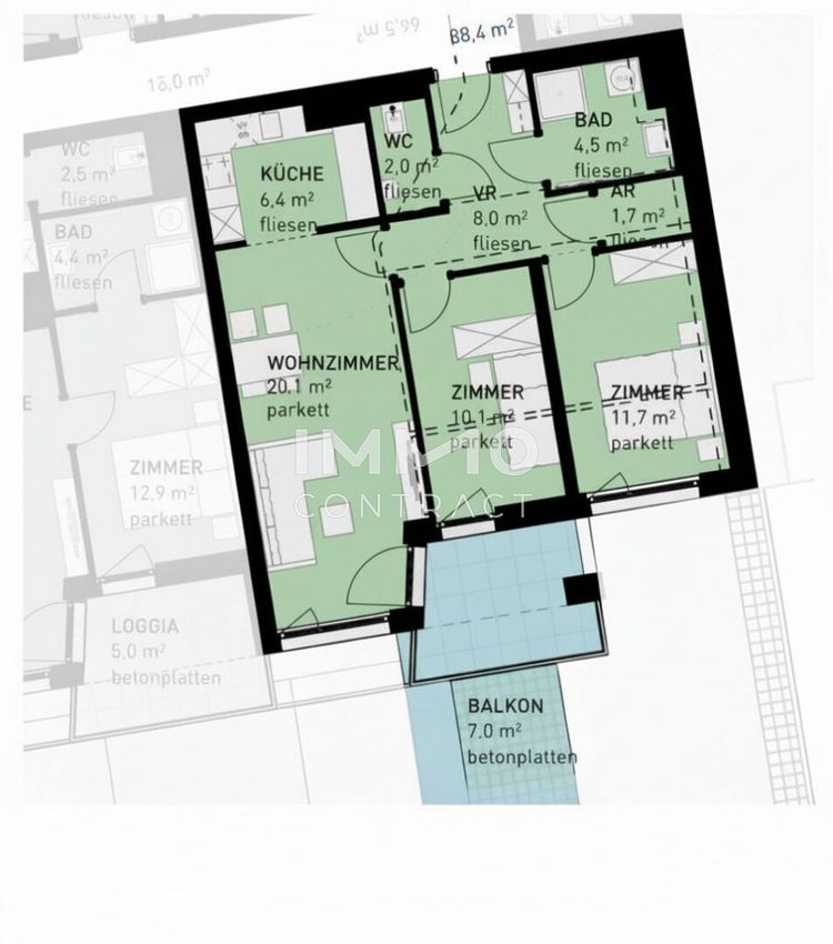 - Jede Wohnung mit privater Freifläche (Loggia, Balkon, Terrasse, Eigengarten)