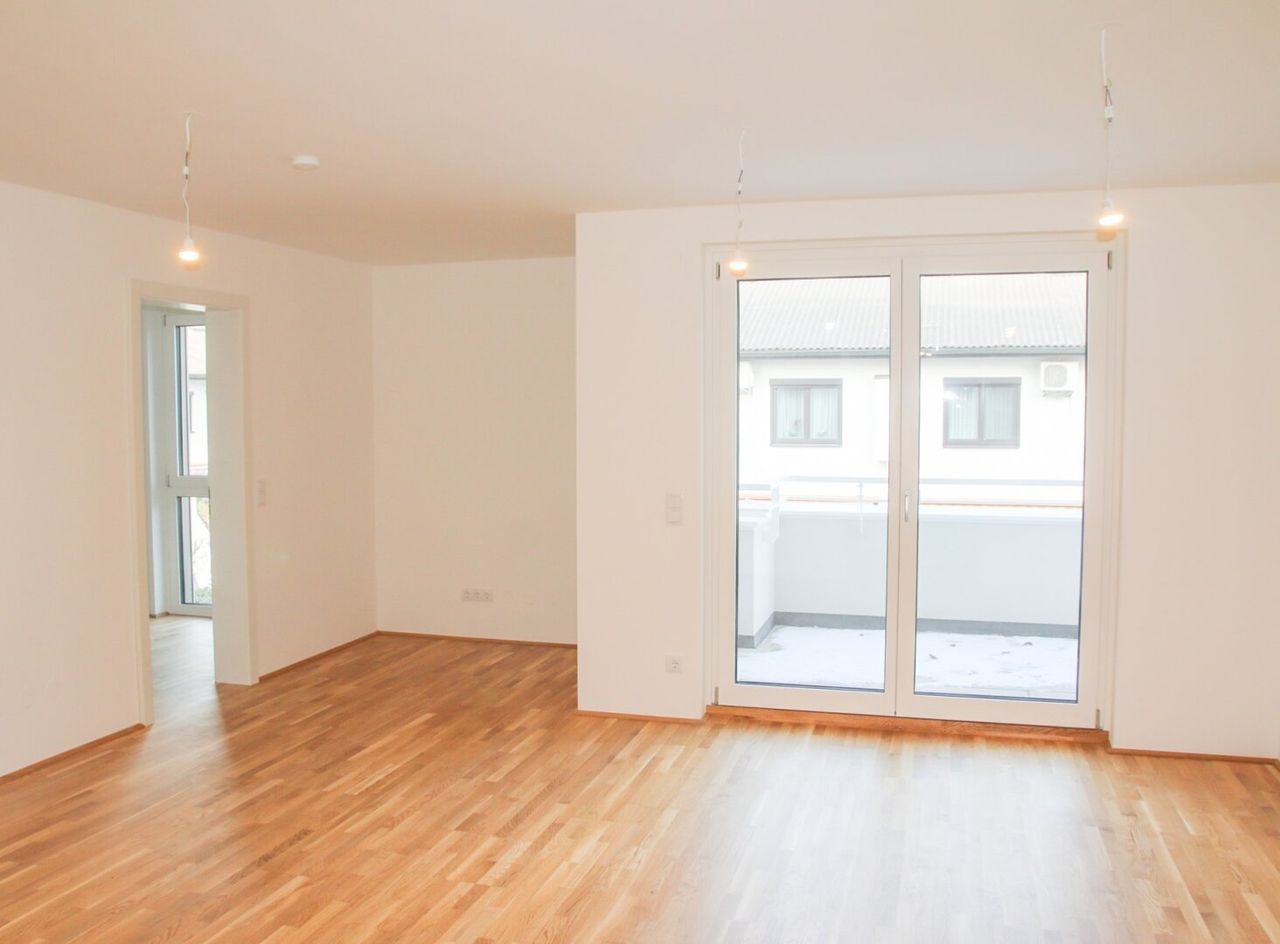 Der Eingangsbereich führt in einen funktional gestalteten Vorraum, von dem aus alle Räume zentral erreichbar sind. Der offen konzipierte Wohn-/Essbereich mit integrierter Küche (ca. 26,37 m²) bildet den Mittelpunkt der Wohnung. Großzügige Fensterflächen sorgen für ein helles, freundliches Raumgefühl und führen direkt auf den Balkon, der den Wohnraum sinnvoll nach außen erweitert.