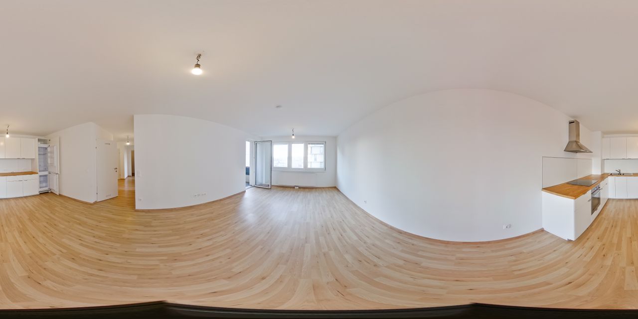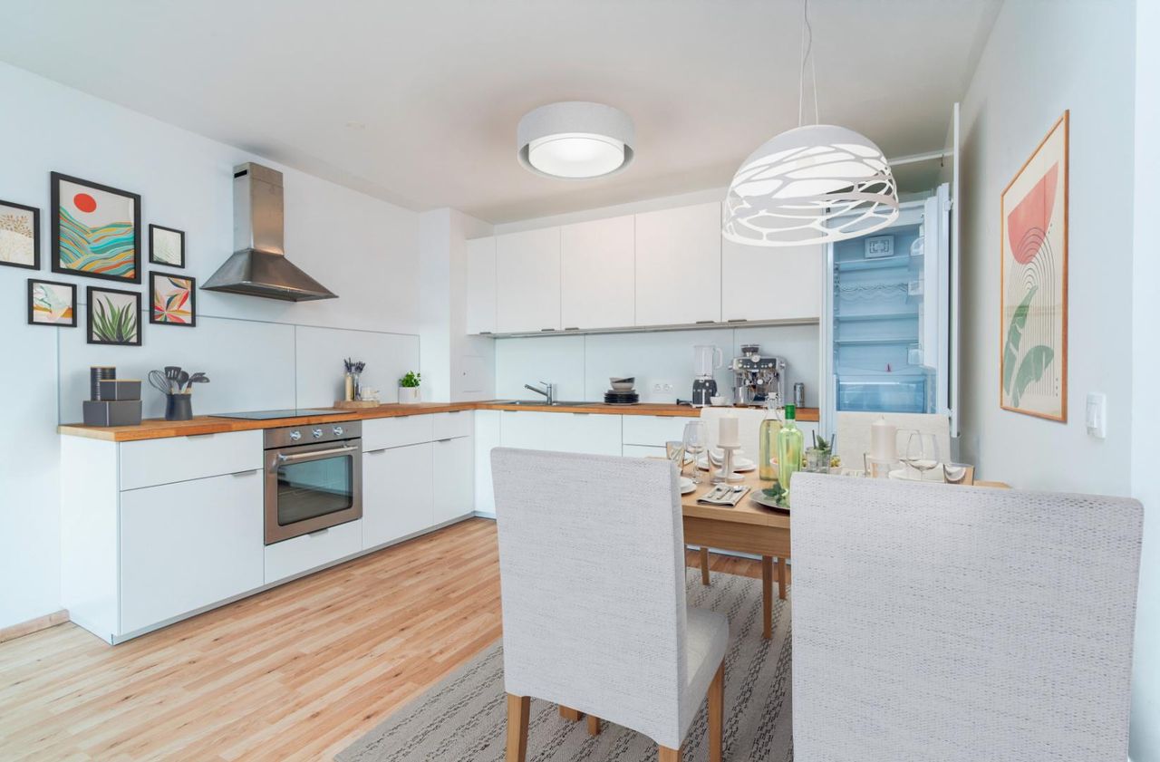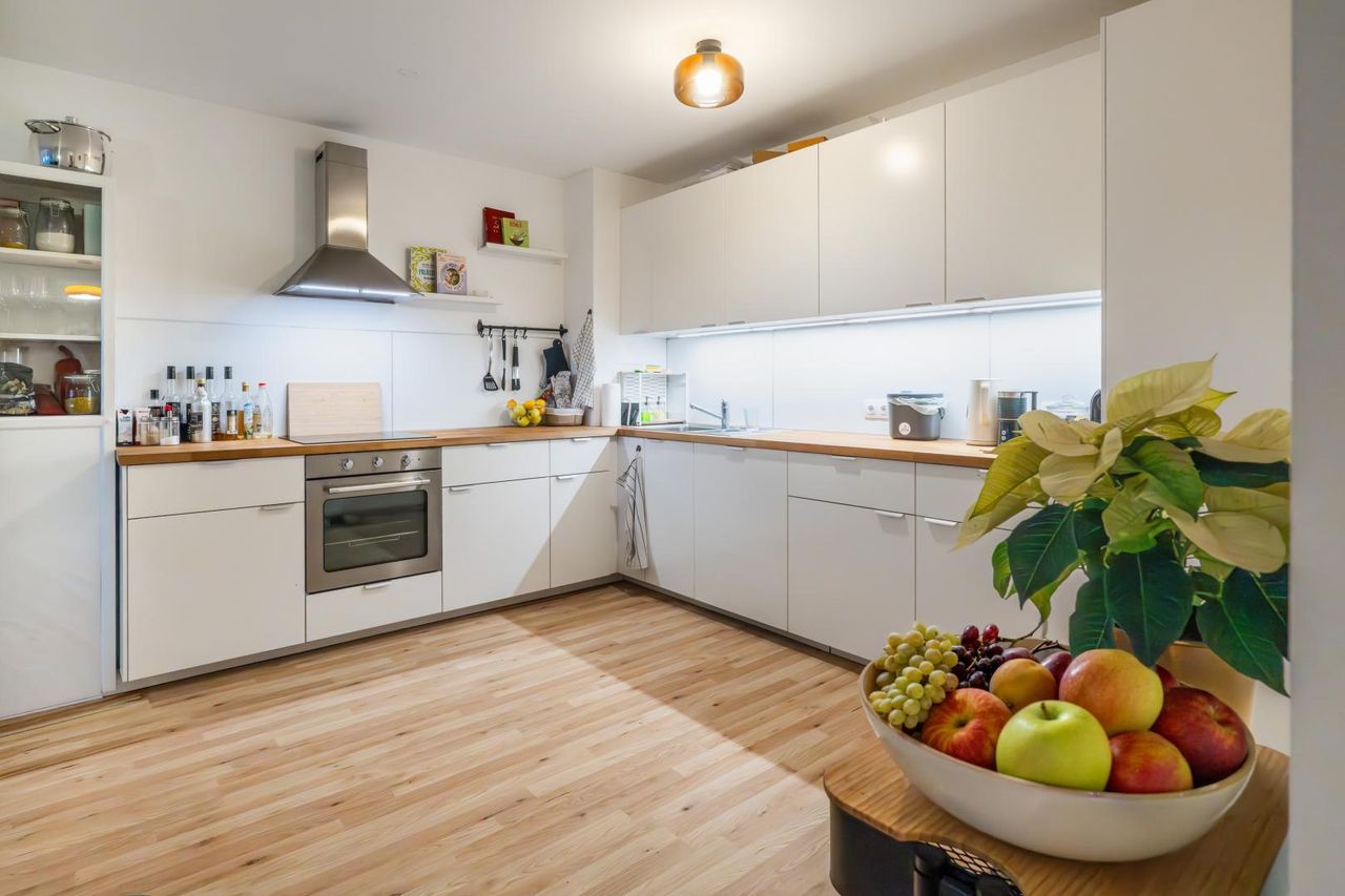 Die über 32 m² große moderne Wohnküche ist der Dreh- und Angelpunkt der Wohnung. Mit einer neuwertigen Eckeinbauküche, Kühl-Gefrierkombination und viel Stauraum können Sie hier nach Herzenslust kochen und genießen. Genug Platz für einen großen Familientisch ist ebenfalls vorhanden.