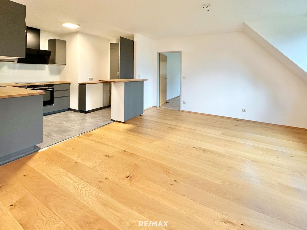 Rechts das Badezimmer, links das WC und geradeaus geht es in das große Wohn-Ess-Zimmer. Von dort weiter in ein geräumiges Zimmer, z.B. ein Schlafraum.