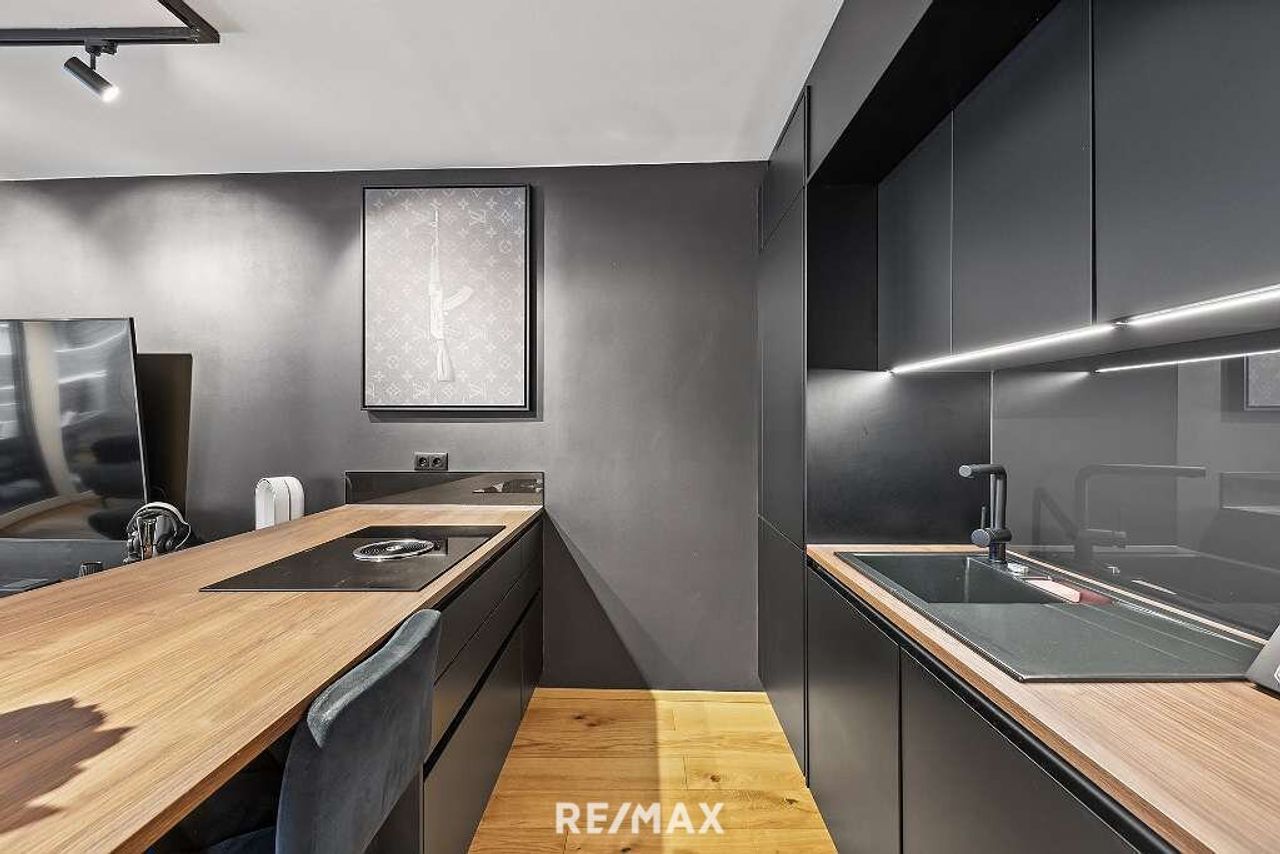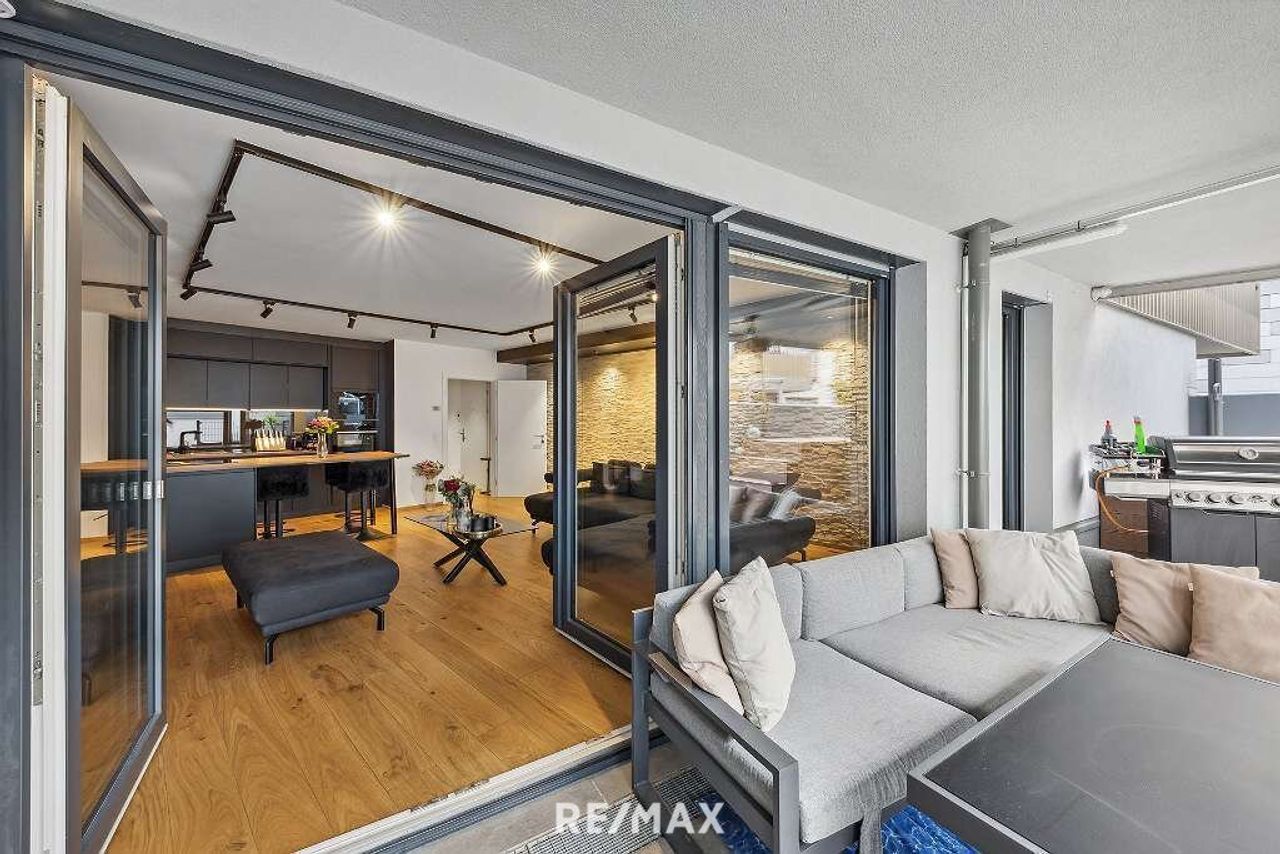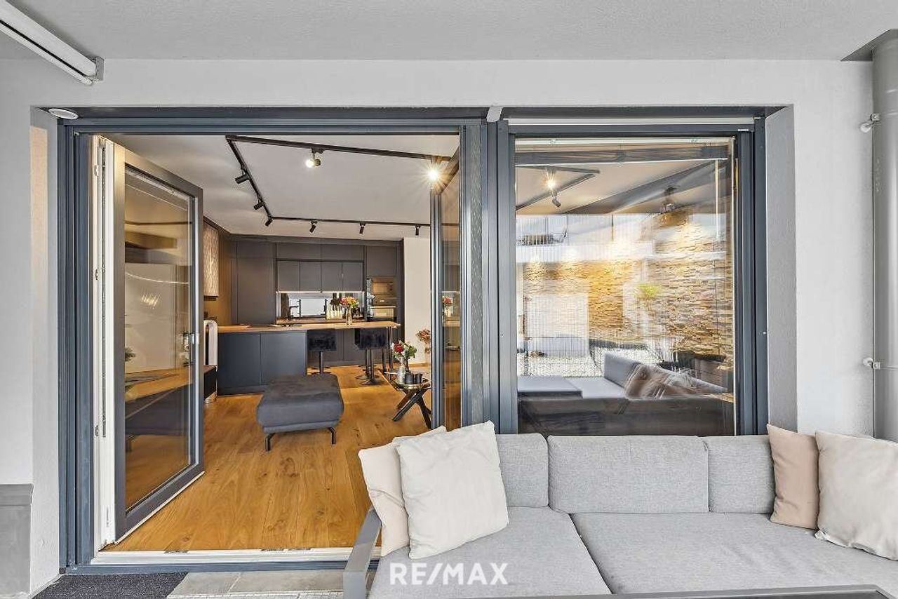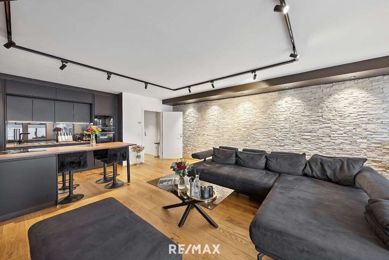 Hochwertige stylische Ausstattung im gesamten Objekt. Sehr helles Wohnzimmer mit Essbereich und Dan-Küche samt Bora Geräten.