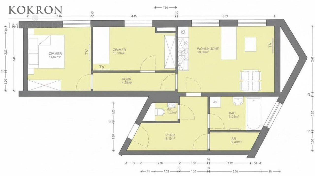 Sie gelangen von Ihrer Wohnküche über einen zusätzlichen Vorraum zu den 2 Zimmern (ca. 11,7 und 10,2m²).