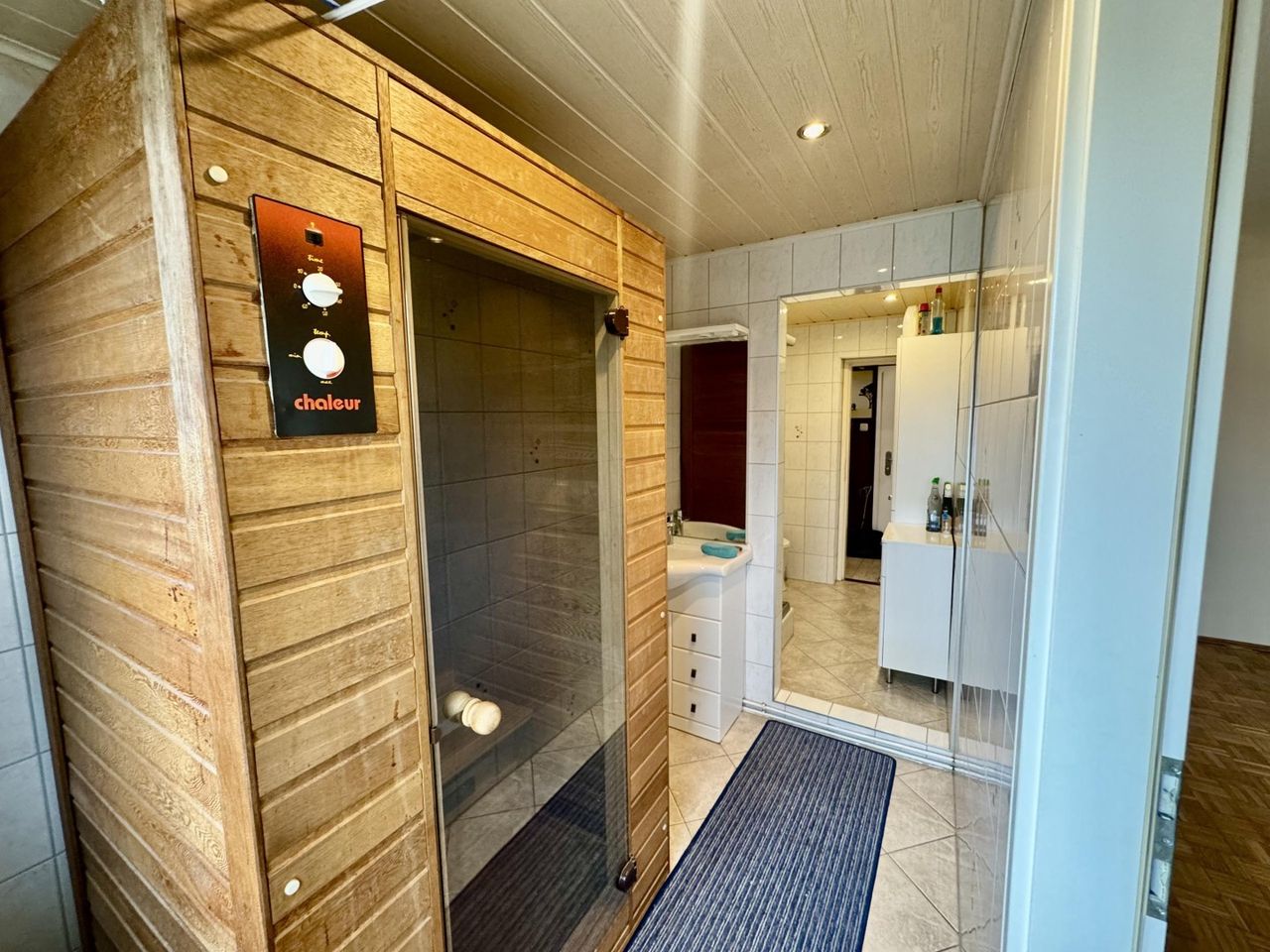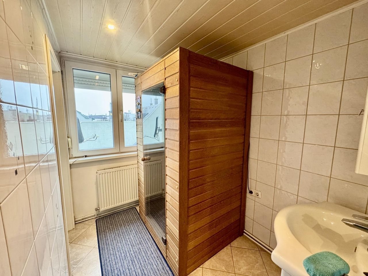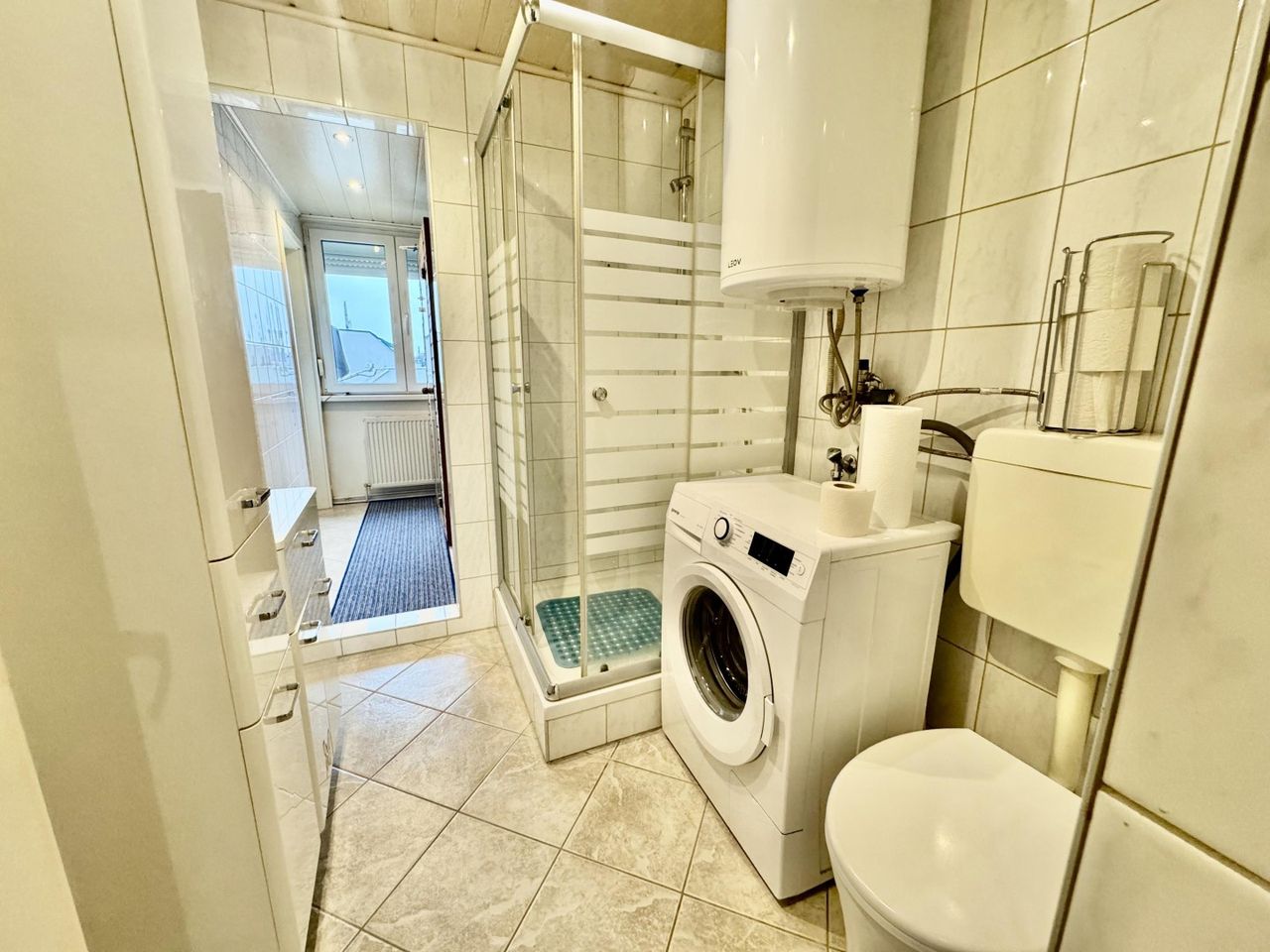 Zentral in der Wohnung befindet sich das Badezimmer, das sowohl vom Vorzimmer als auch direkt vom Schlafzimmer zugänglich ist – ein Vorteil für Komfort und Alltag.