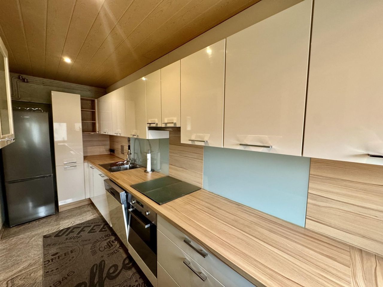 Vom Wohnzimmer aus gelangt man in die separate, modern ausgestattete Küche – ideal für Kochabende und täglichen Komfort.