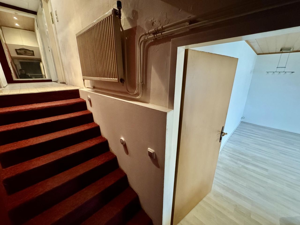 Rechts vom Vorzimmer führen ein paar Stufen hinunter in den wohnbereich, der großzügig geschnitten ist und vielseitige Gestaltungsmöglichkeiten bietet.