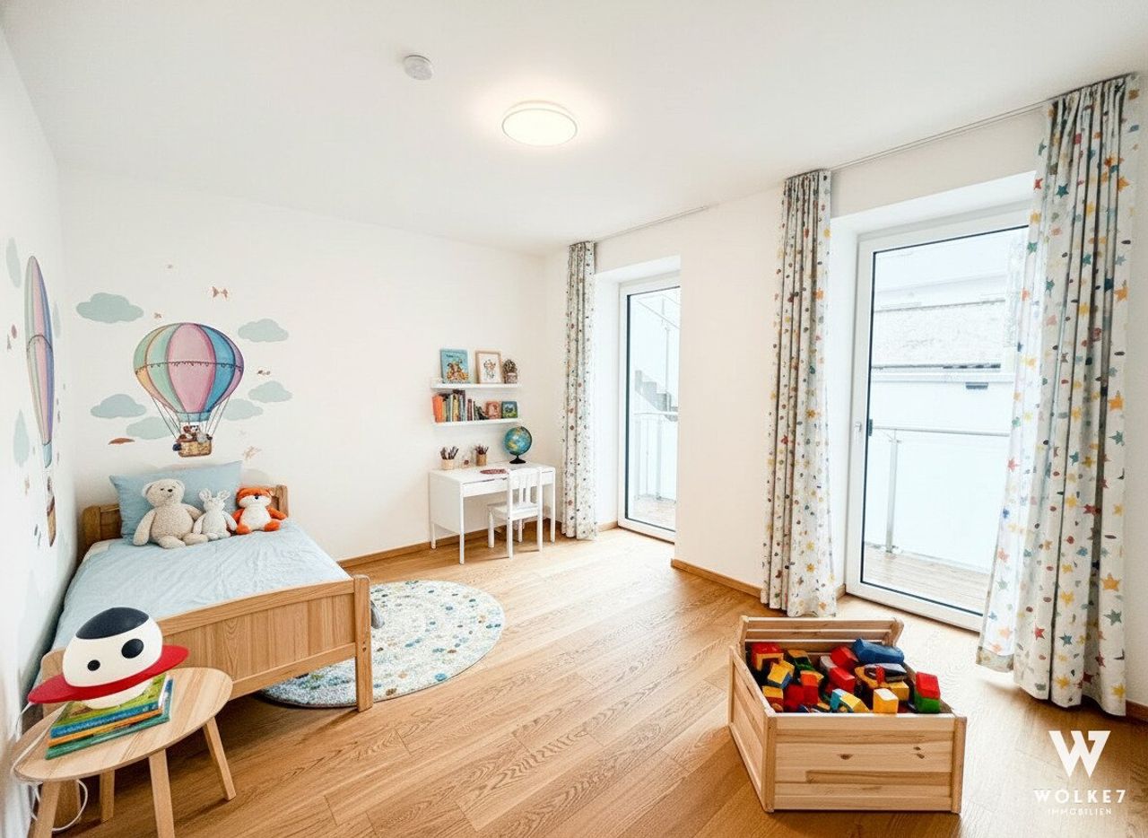 Die Wohnung präsentiert sich in ausgezeichnetem Zustand mit hochwertiger Ausstattung – geölter Eichenparkett, Fußbodenheizung via Luftwärmepumpe, ein ca. 14 m² großer Eigengarten sowie ein Terrassenausgang direkt vom Schlaf-/Kinderzimmer runden das Angebot ab.