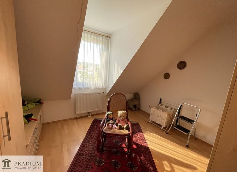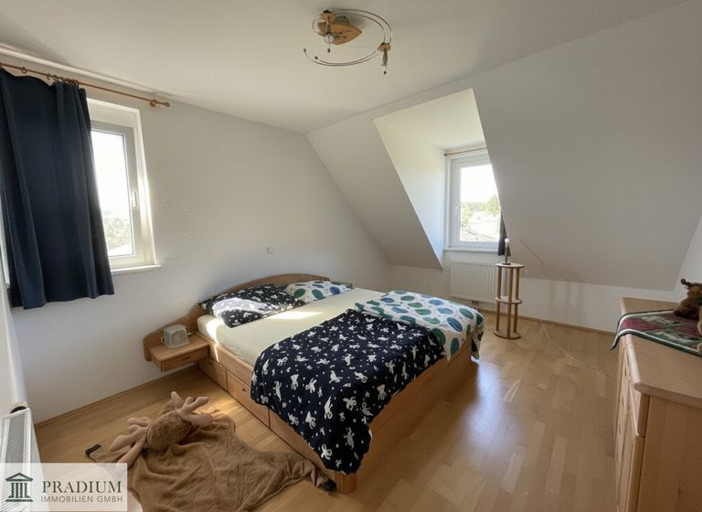 Über die Holztreppen in der oberen Wohnebene angekommen findet man 2 Zimmer, 1 Badezimmer und 1 WC. Eines der beiden Zimmer ist derzeit als Ankleidezimmer genutzt. Das derzeitige Schlafzimmer ist großzügig bemessen, sodass Doppelbett, Kommode und Kasten bequem Platz finden.