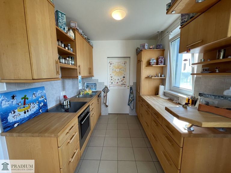 Bei den Einbaumöbeln wurde auf Qualität geachtet, was neben den Einbaukästen, -regalen und dem Essbereich mit einer Vollholzküche vollendet wurde. Neben der Küche gibt es eine Speis, die auch den Waschmaschinenanschluss beherbergt.
