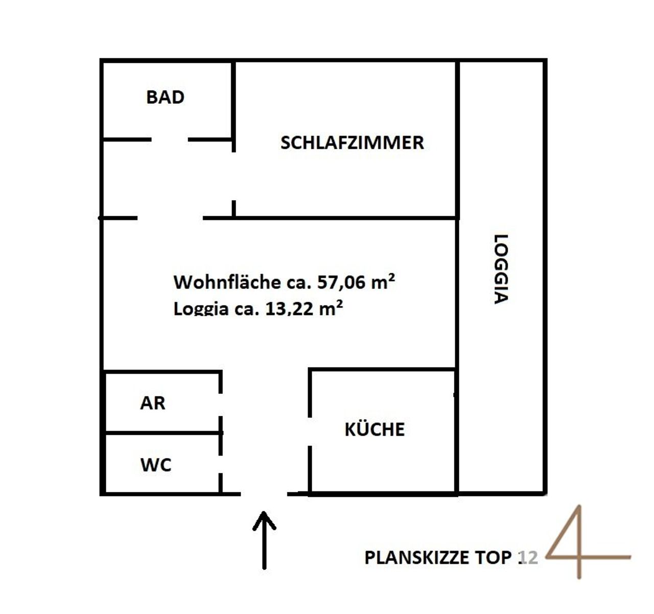 Wohnfläche: ca.57,06m² + Loggia + Kellerabteil Vorraum Küche Wohnzimmer Loggia 13,22m² 1 Zimmer Badezimmer mit Badewanne Abstellraum separates WC