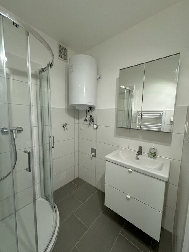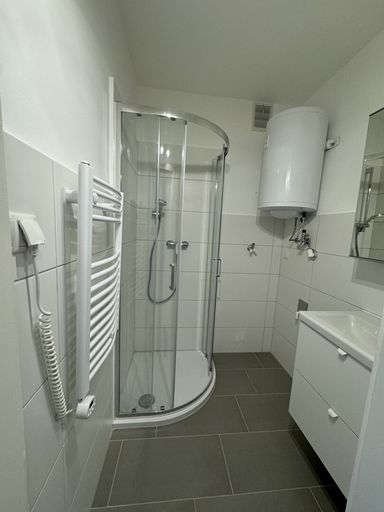 • Badezimmer mit Dusche, Handwaschbecken, Therme und elektrischem Handtuchtrockner