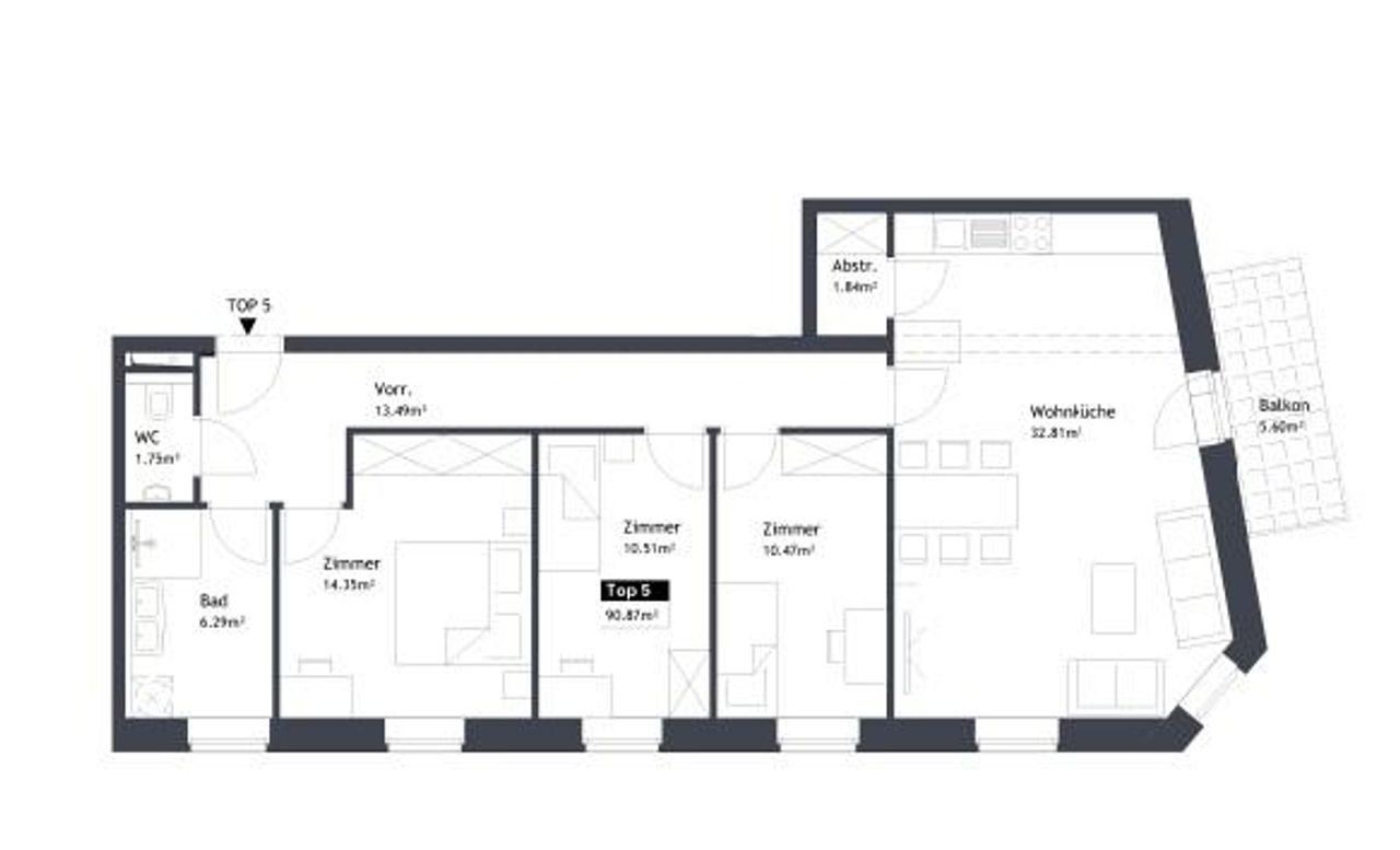 Vorraum, Wohnraum mit Essplatz und Küche, 3 weitere Zimmer, Badezimmer, WC separat, Abstellraum, Balkon