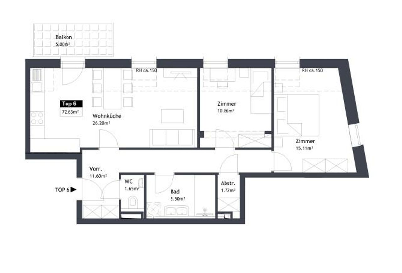 Vorraum, Wohnraum mit Essplatz und Küche, 2 weitere Zimmer, Badezimmer, WC separat, Abstellraum, Balkon