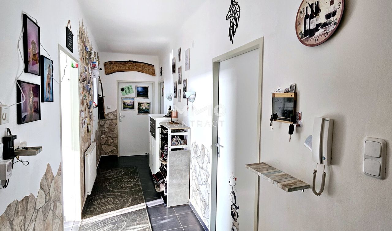 Die Wohnung besteht aus einem geräumigen Wohnzimmer, 2 großen Schlafzimmern, Küche mit Essecke, Bad, separatem WC, Balkon und einem Vorzimmer, von welchem alle Zimmer zentral zu begehen sind.