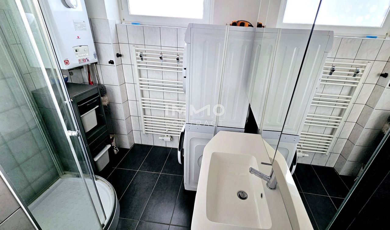 Das Bad ist mit einer Regendusche und modernen Einbaumöbeln ausgestattet und bietet genug Platz für Ihre Waschmaschine.