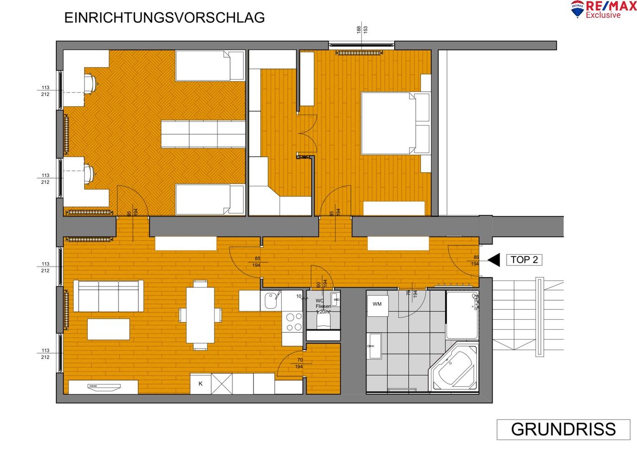 Vorraum, Badezimmer, separates WC, 2 Schlafzimmer, Schrankraum, großzügiger Wohn-/Essbereich, Abstellraum