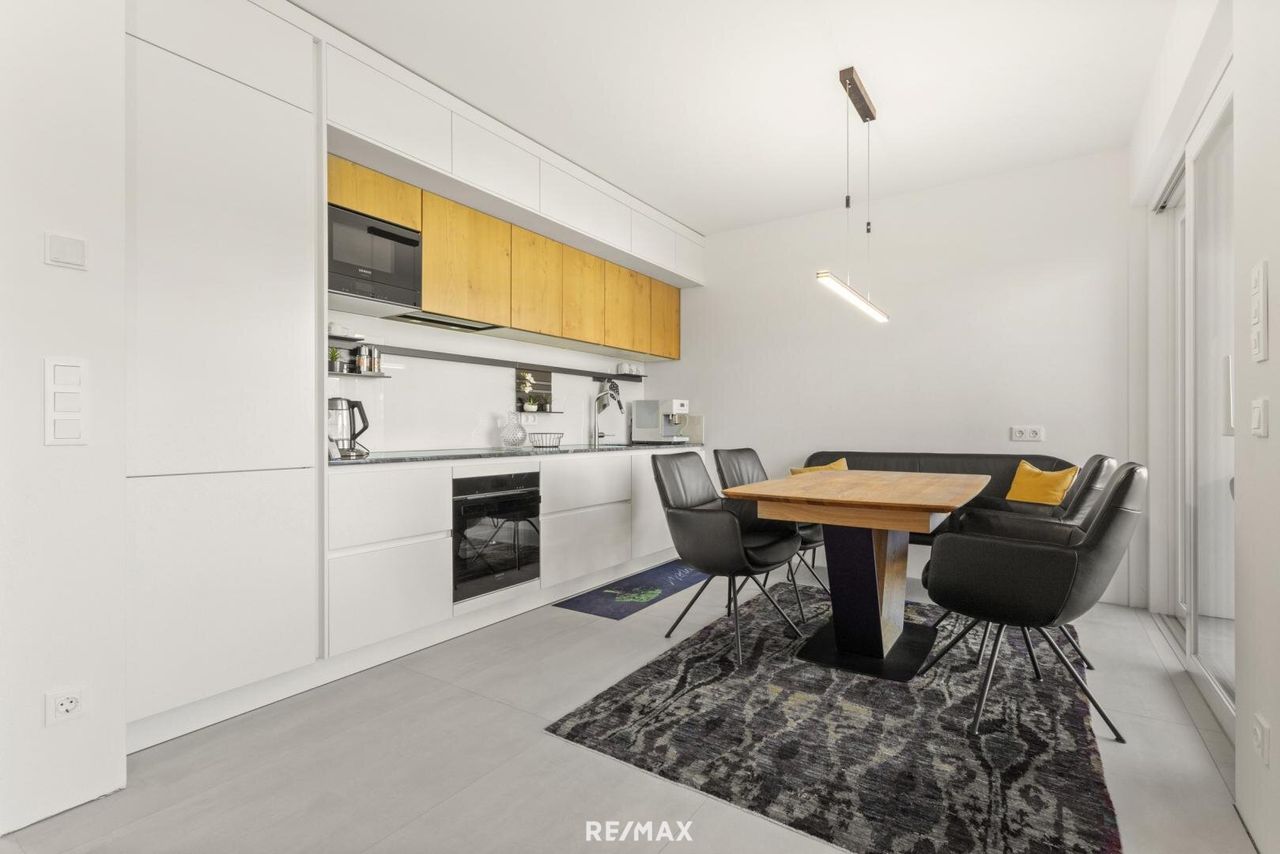Die moderne Einbauküche ist mit hochwertigen Markengeräten ausgestattet und lässt keine Wünsche offen. Zwei (Schlaf-)Zimmer, ein elegantes Badezimmer mit bodengleicher Dusche und WC sowie ein separates Gäste-WC runden das Raumangebot harmonisch ab.